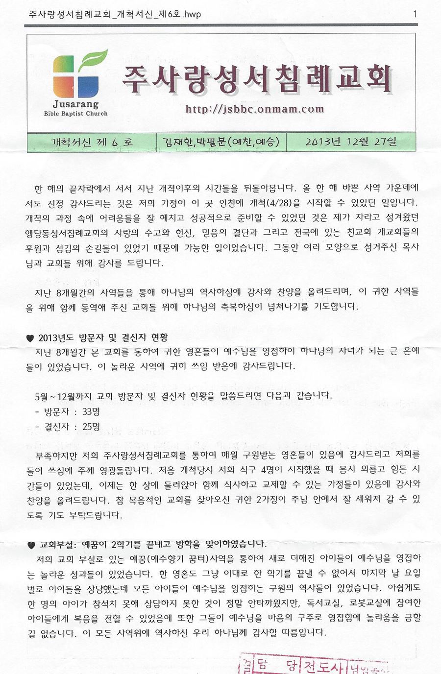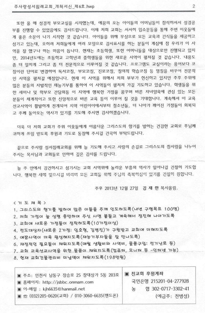 인천-2013년 12월 27일 주사랑성서침례교회 개척서신