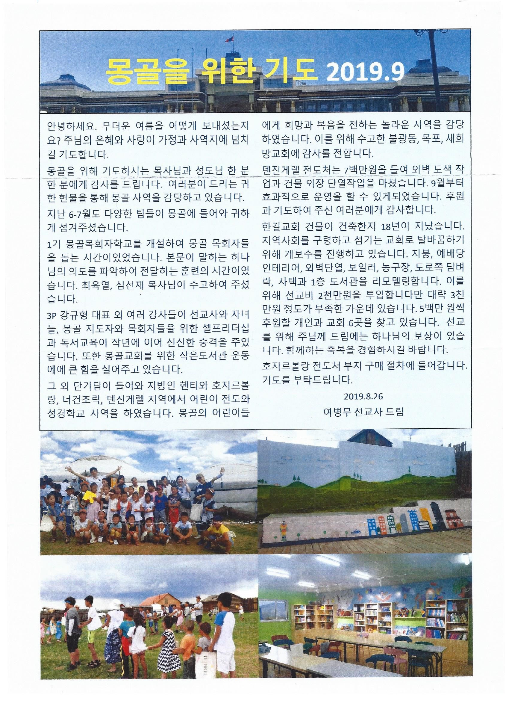 몽골 - 2019년 8월 "몽골을 위한 기도" 여병무선교사