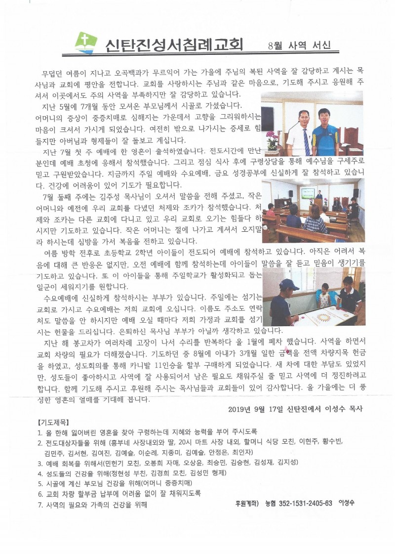 대전 - 2019년 9월 [신탄진성서침례교회] 사역서신