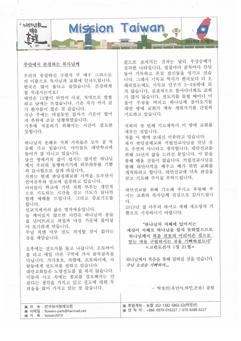 대만 - 2019년 12월 [대만선교편지]