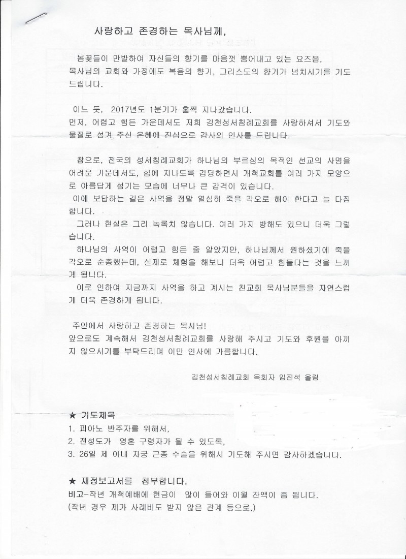 김천 - 2017년 3월 [김천성서침례교회 개척서신] 임진석목회자님