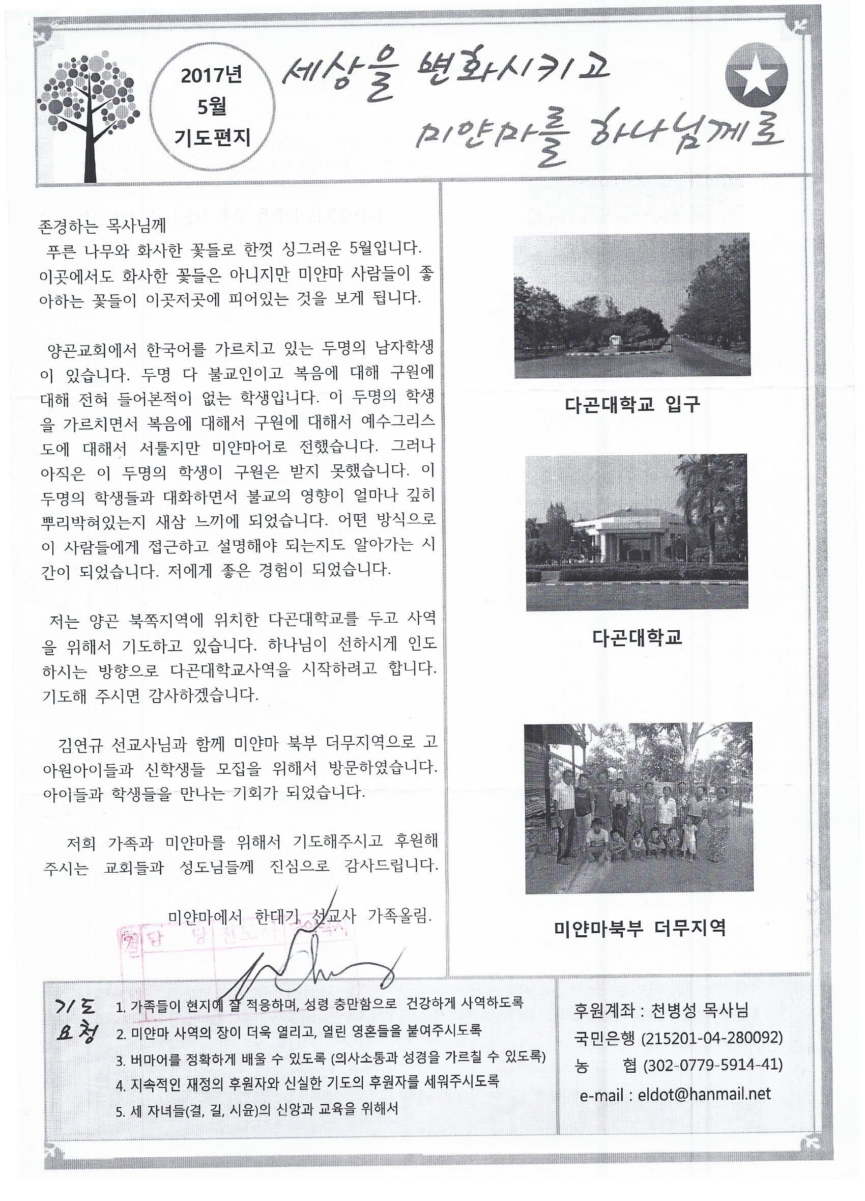 미얀마 - 2017년 5월 "세상을 변화시키고 미얀마를 하나님께로" (한대기선교사)