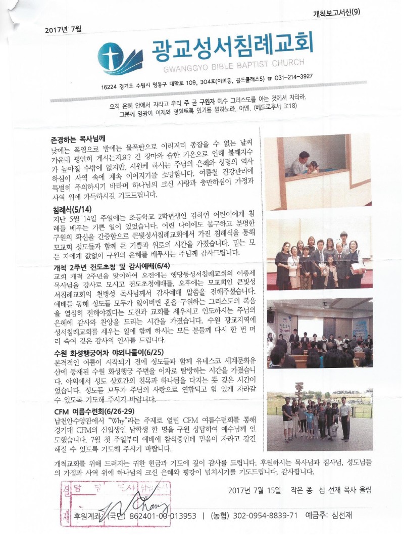 경기도 - 2017년 7월 15일 (광교성서침례교회 개척서신)