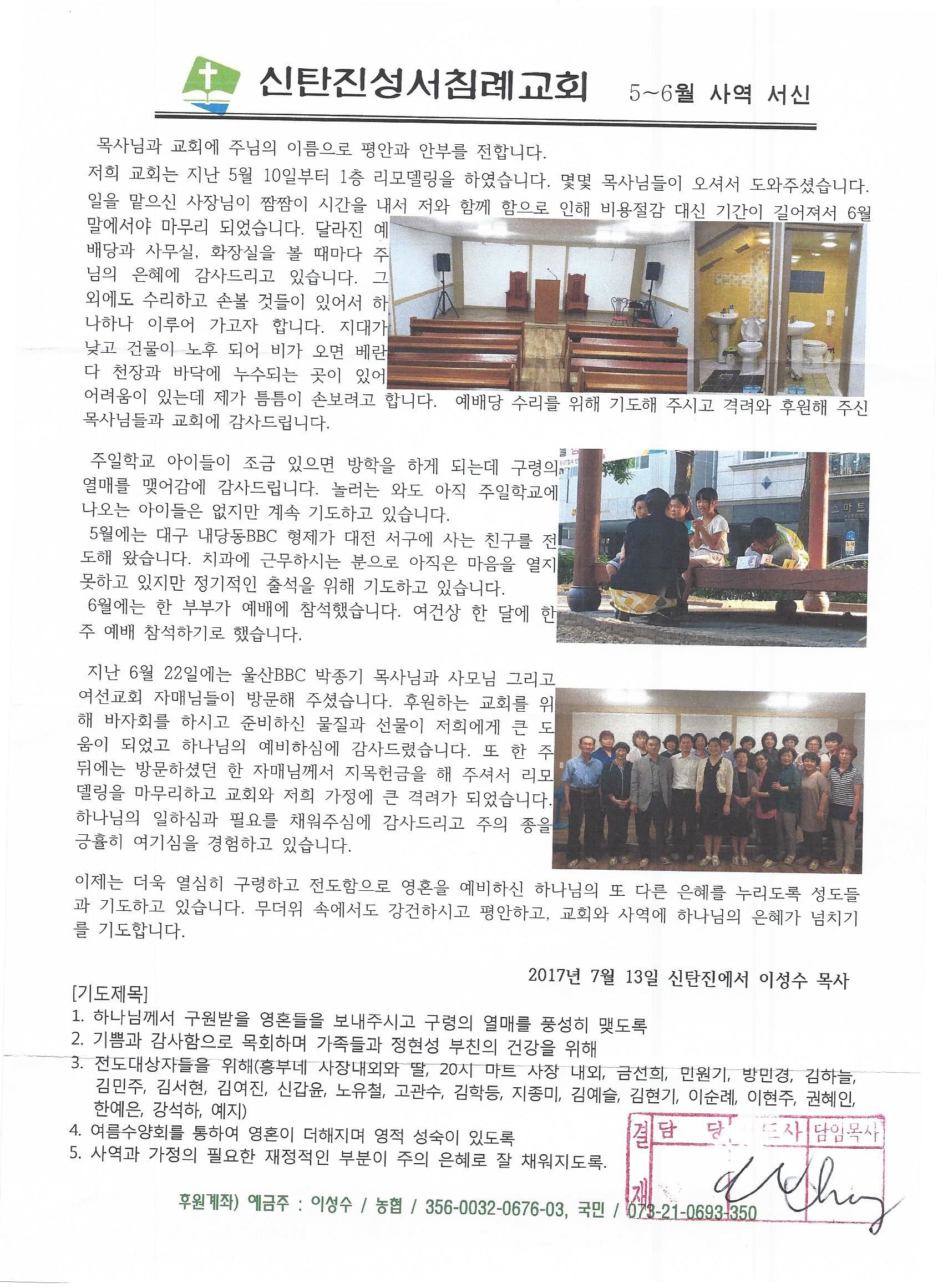 대전 - 2017년 7월 13일 [신탄진성서침례교회 이성수목사님 사역서신]