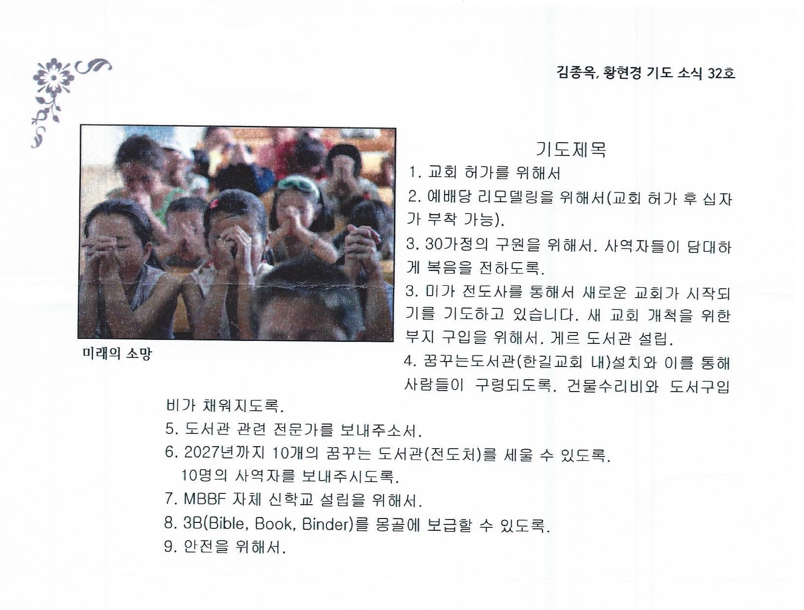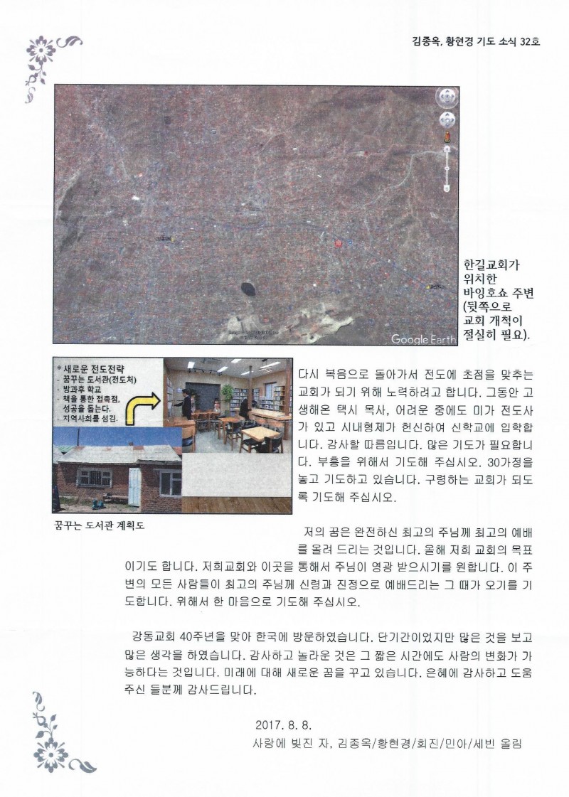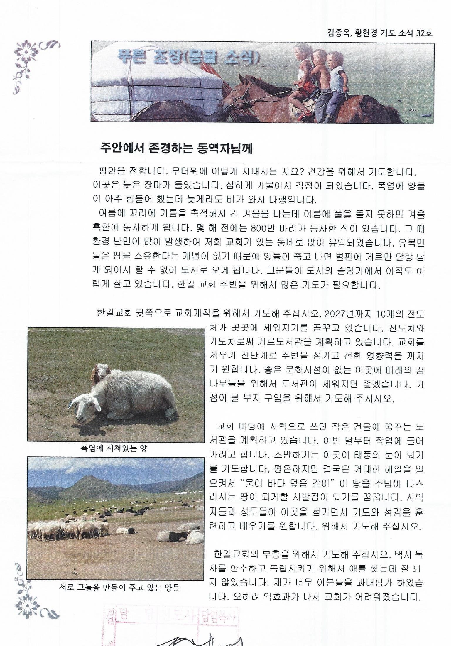 몽골 - 2017년 8월 8일 "주안에서 존경하는 동역자님께" 김종옥선교사