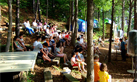 캠프장 야외강단 시원한 바람을 맞으며 나무 그늘 밑에서.