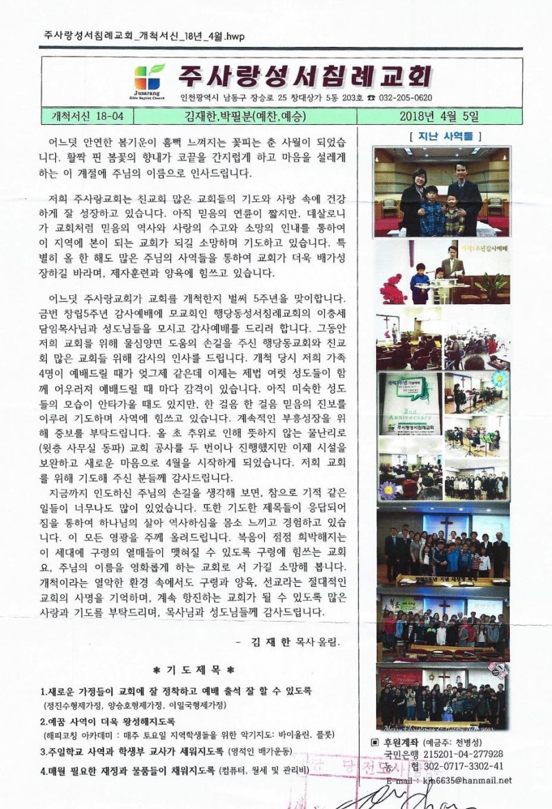 인천 - 2018년 4월 (주사랑성서침례교회 개척서신)