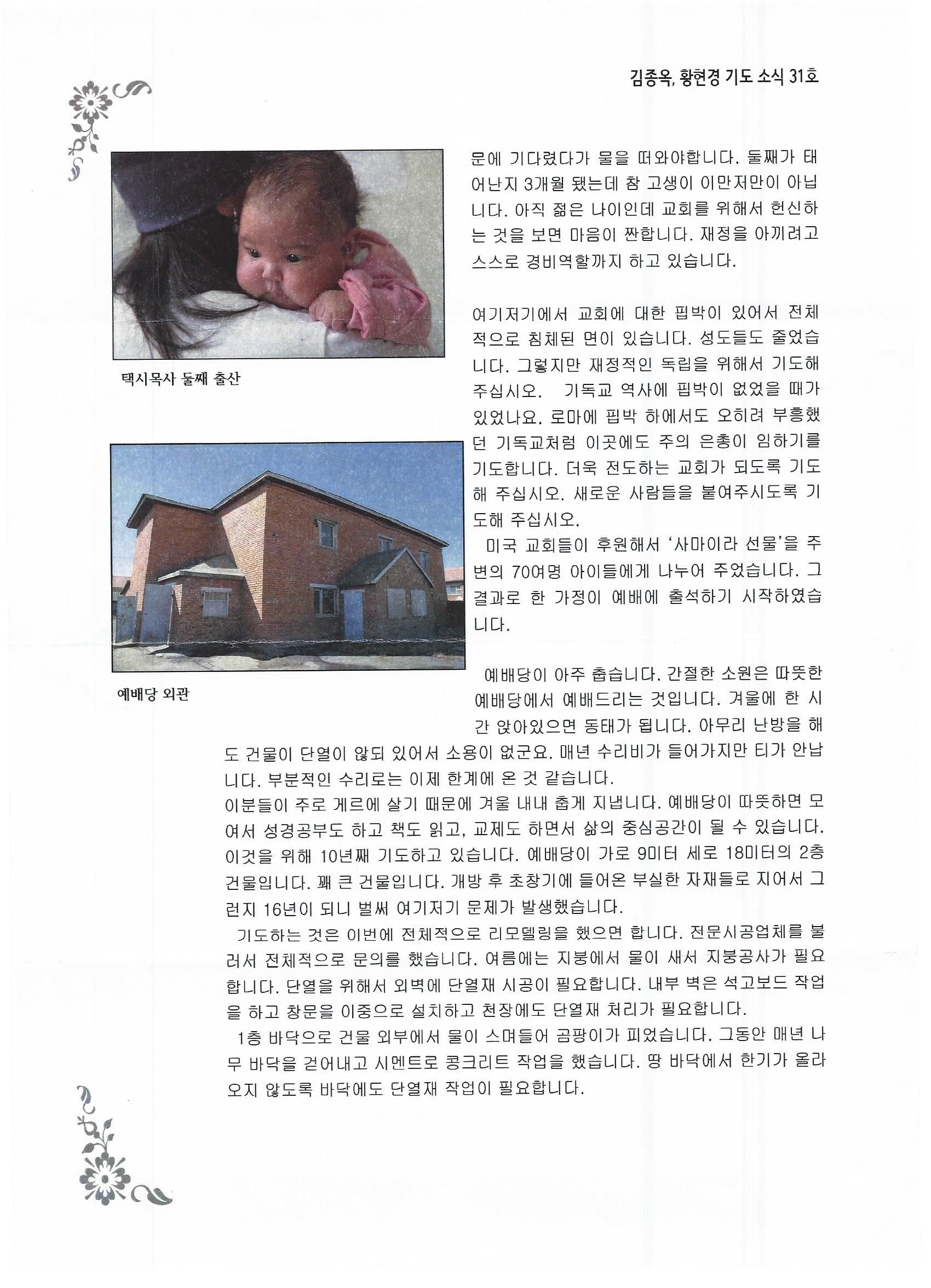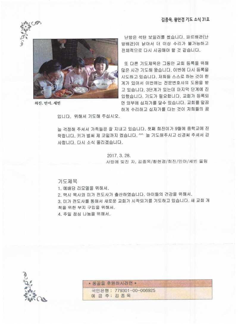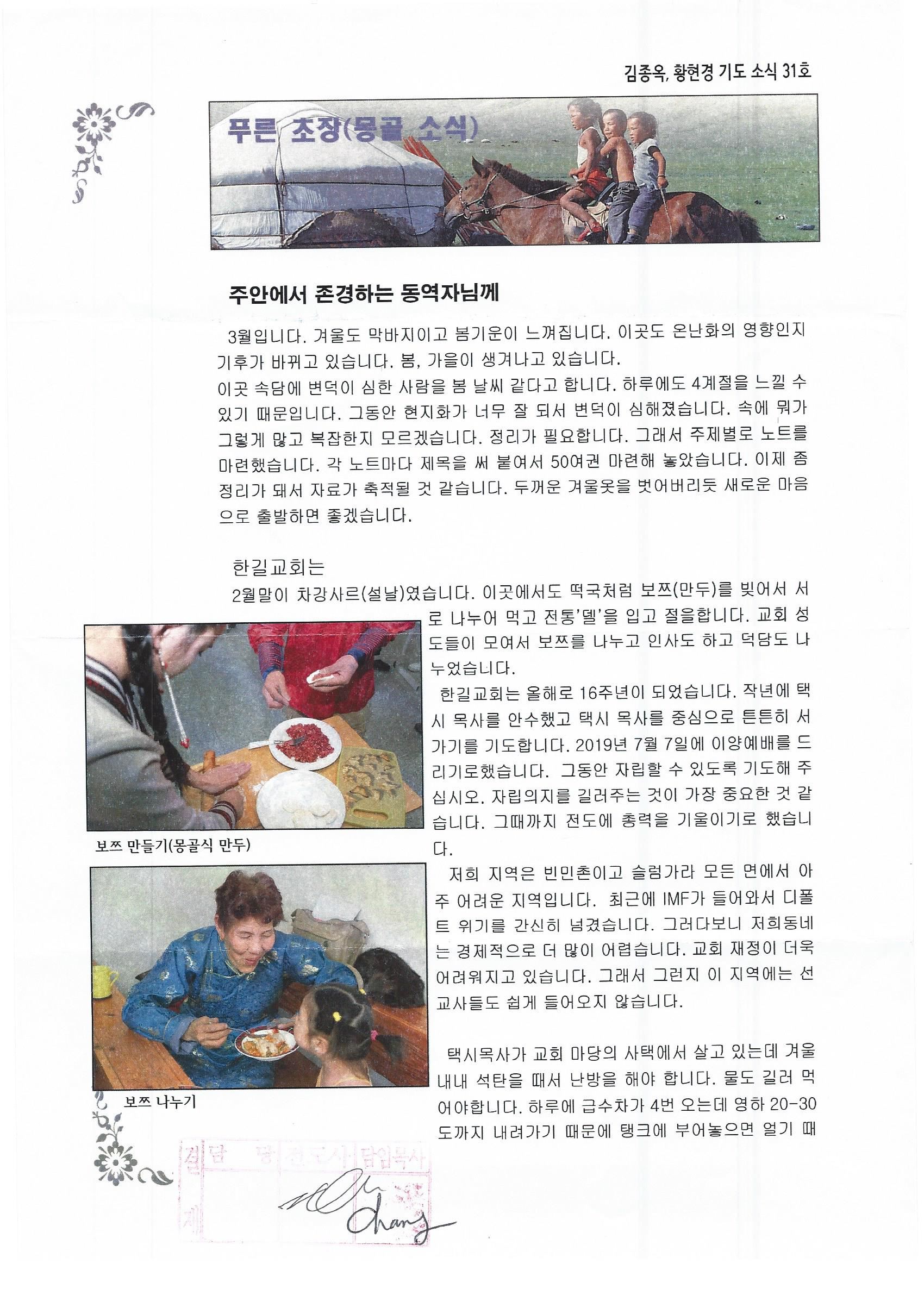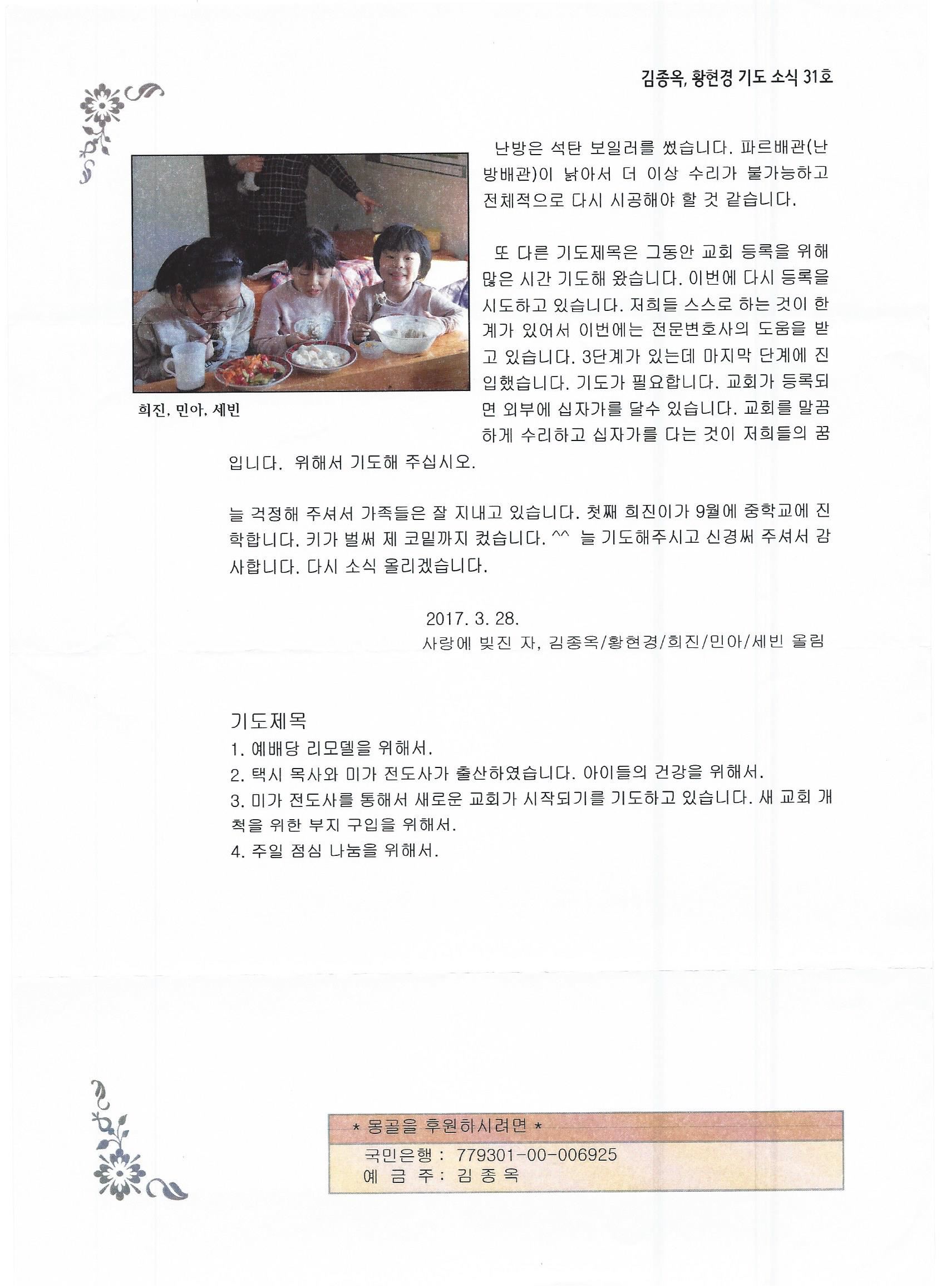 몽골 - 2017년 3월 28일 "주안에서 사랑하는 동역자님께" 김종옥선교사