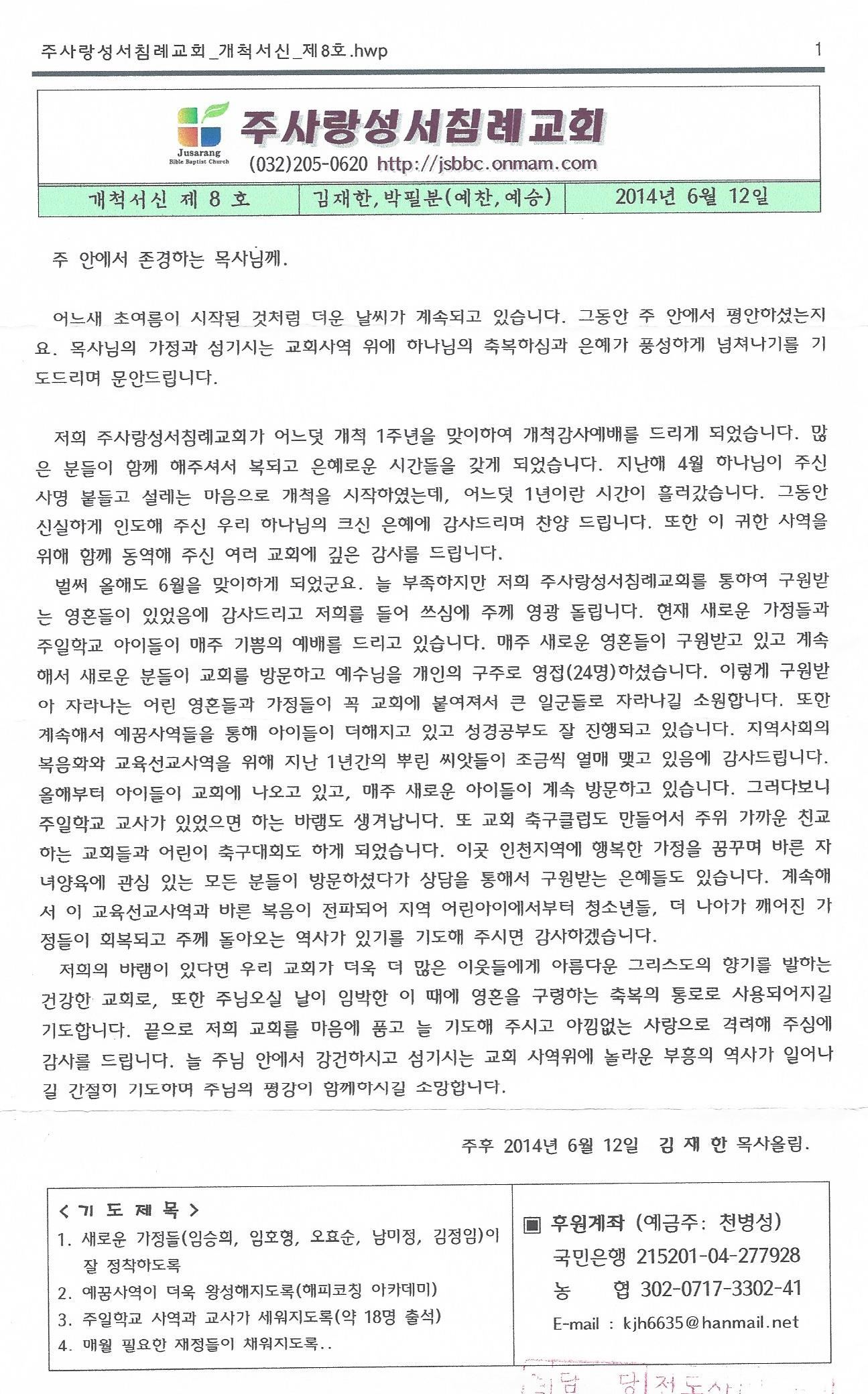 인천-2014년 6월 12일 주사랑성서침례교회 선교편지