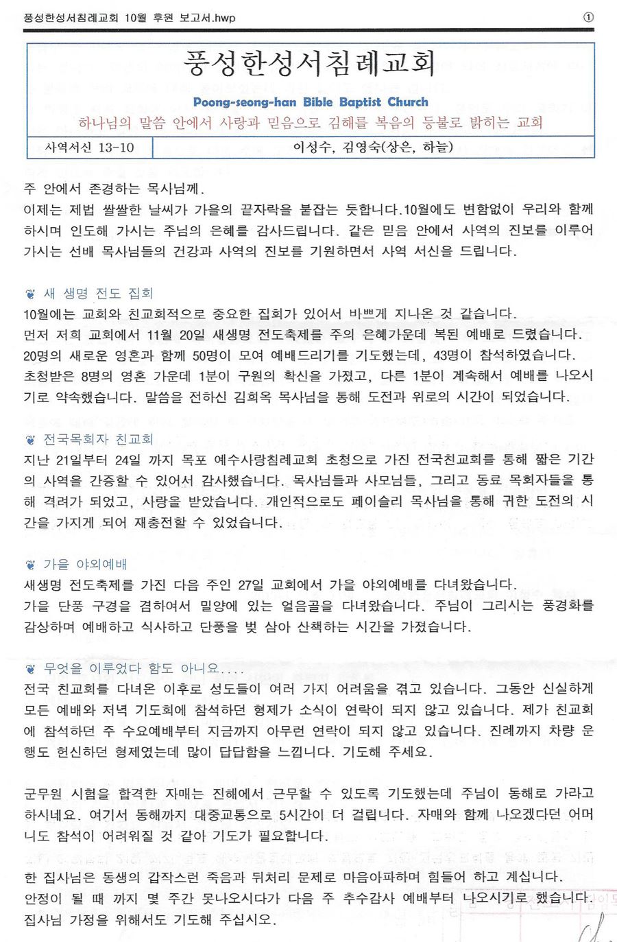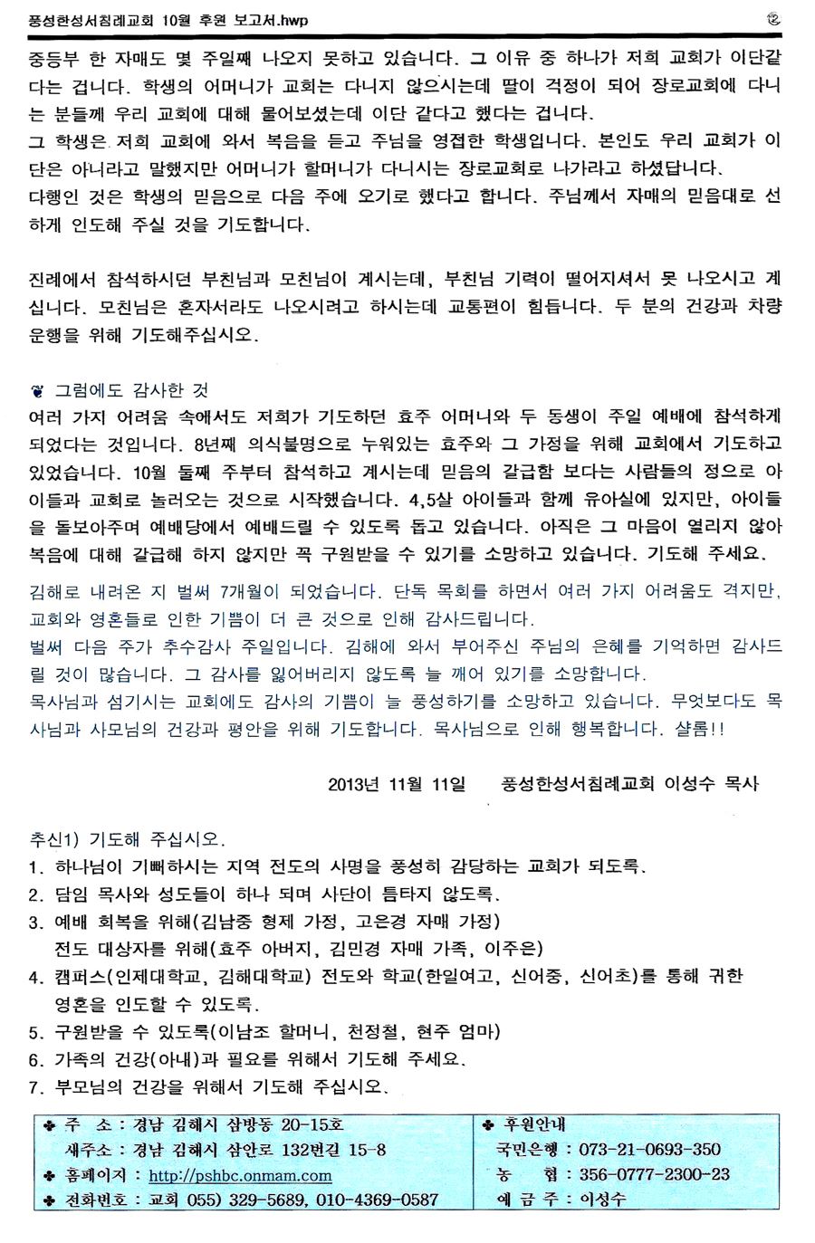 김해-2013년 11월 11일 풍성한성서침례교회 선교편지