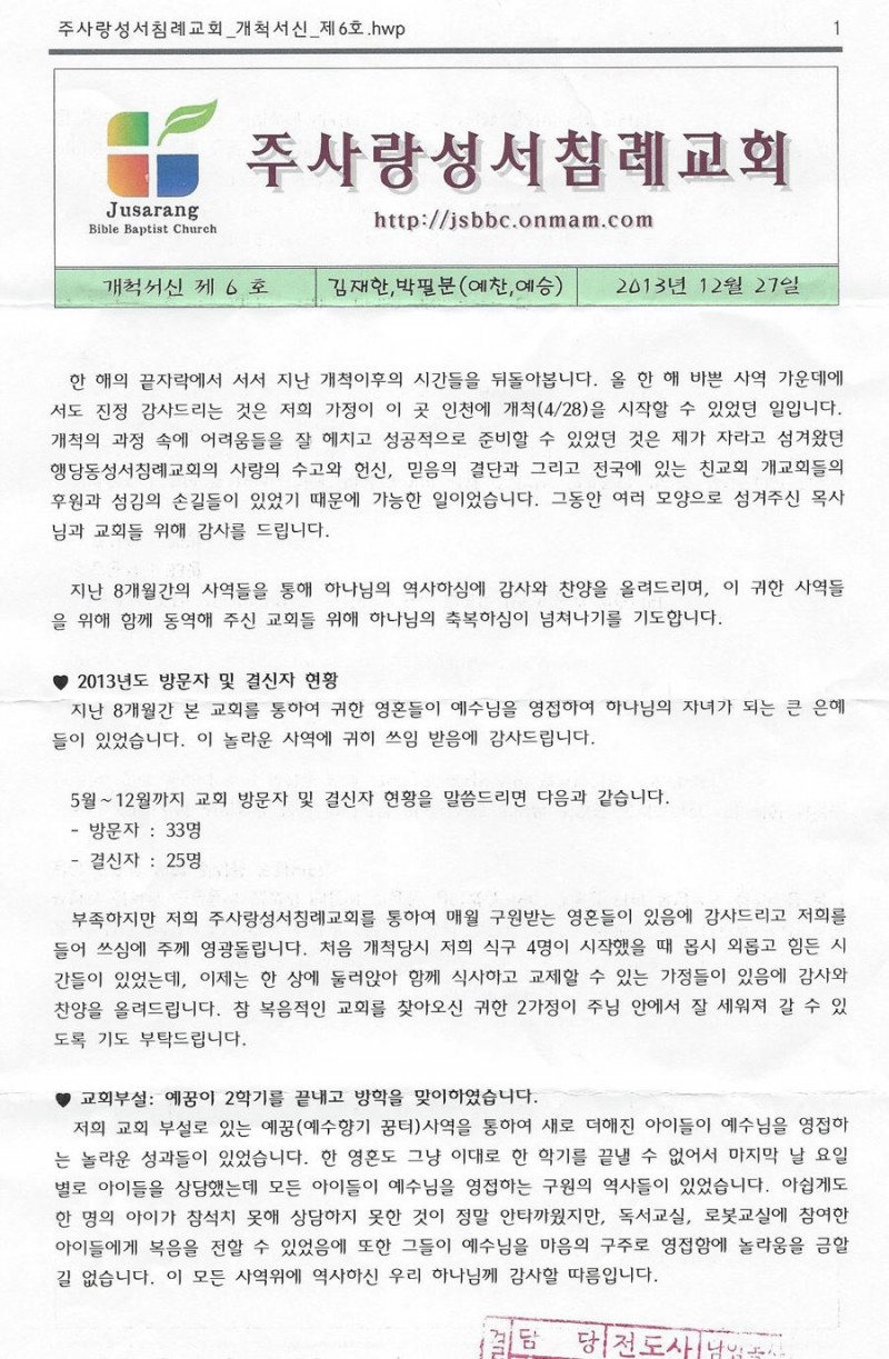 인천-2013년 12월 27일 주사랑성서침례교회 개척서신