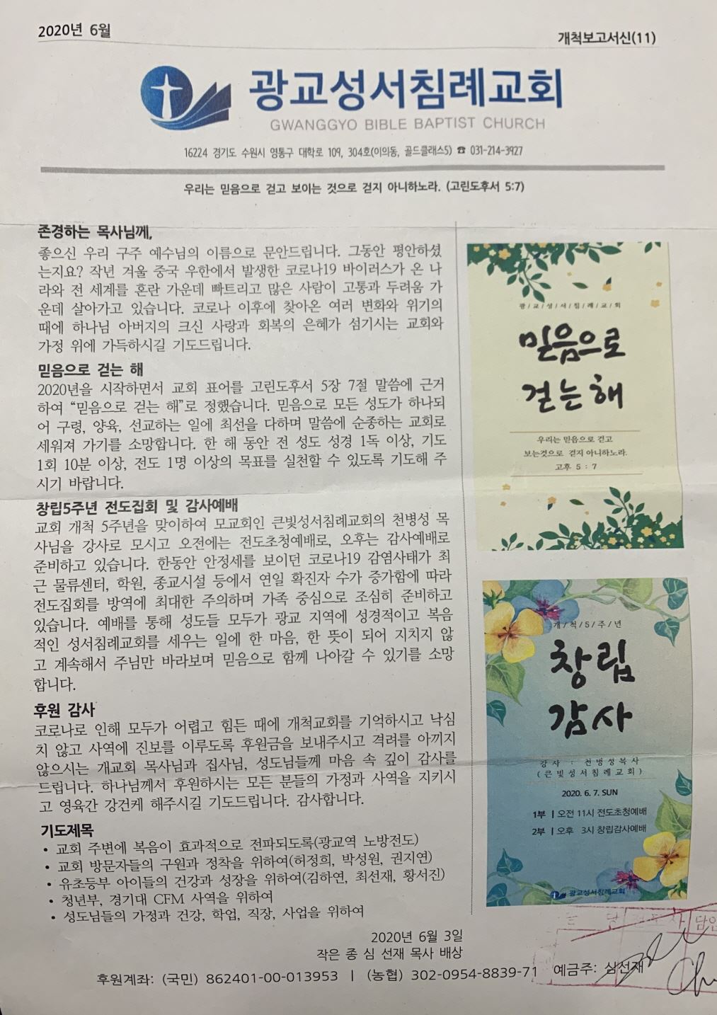 경기도 - 2020년 6월 (광교성서침례교회 개척서신)