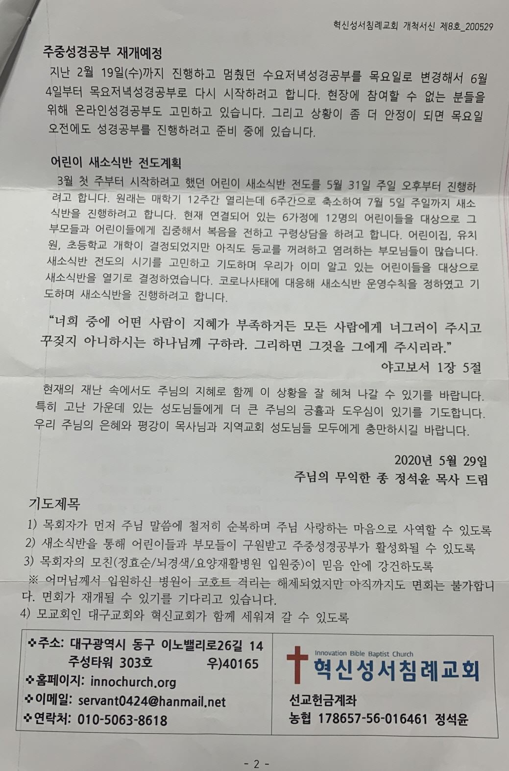 대구 - 2020년 6월 [혁신성서침례교회 개척서신]