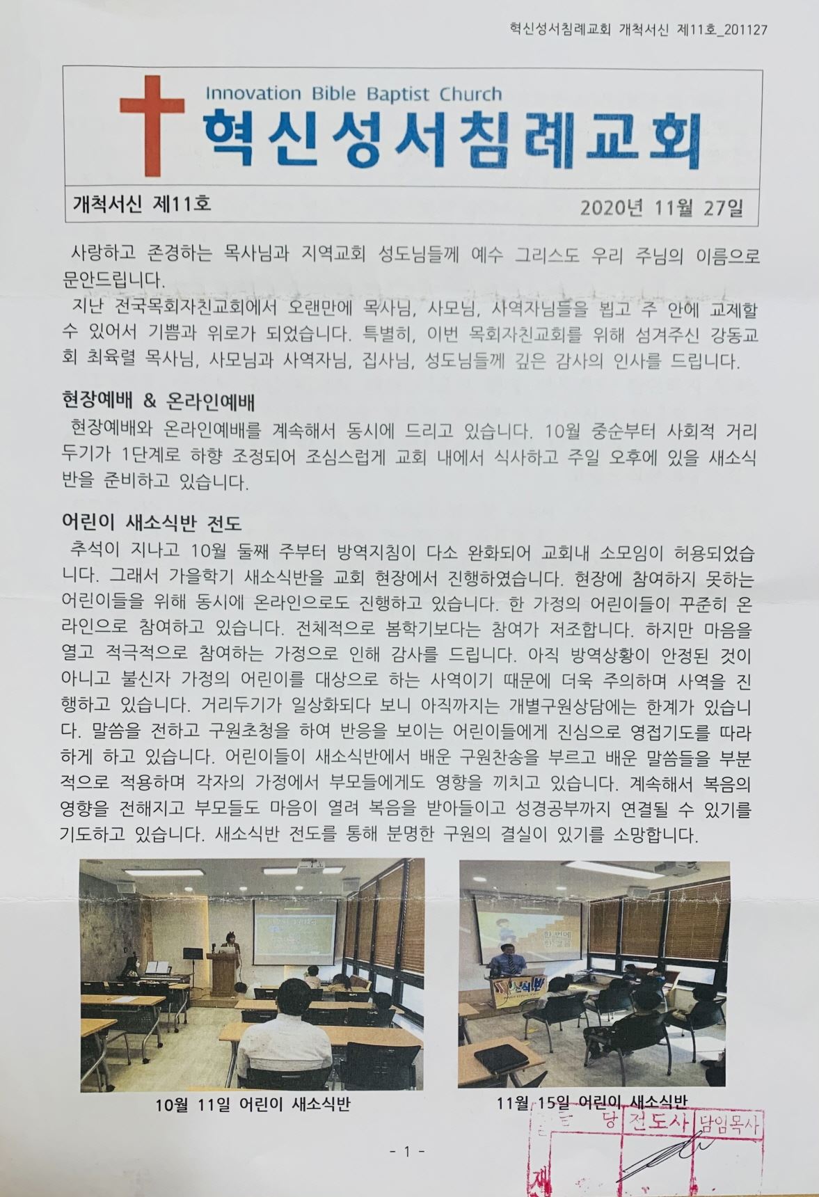 대구 - 2020년 11월 [혁신성서침례교회 개척서신]