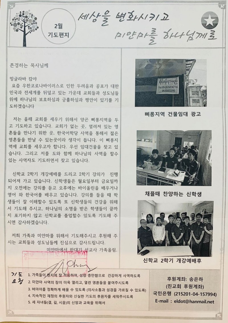 미얀마 - 2020년 2월 "세상을 변화시키고 미얀마를 하나님께로" (한대기선교사)