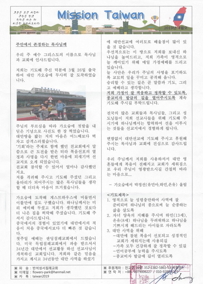 대만 - 2019년 4월 [대만선교편지]