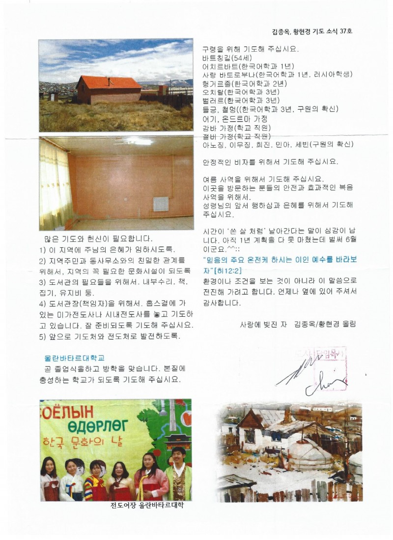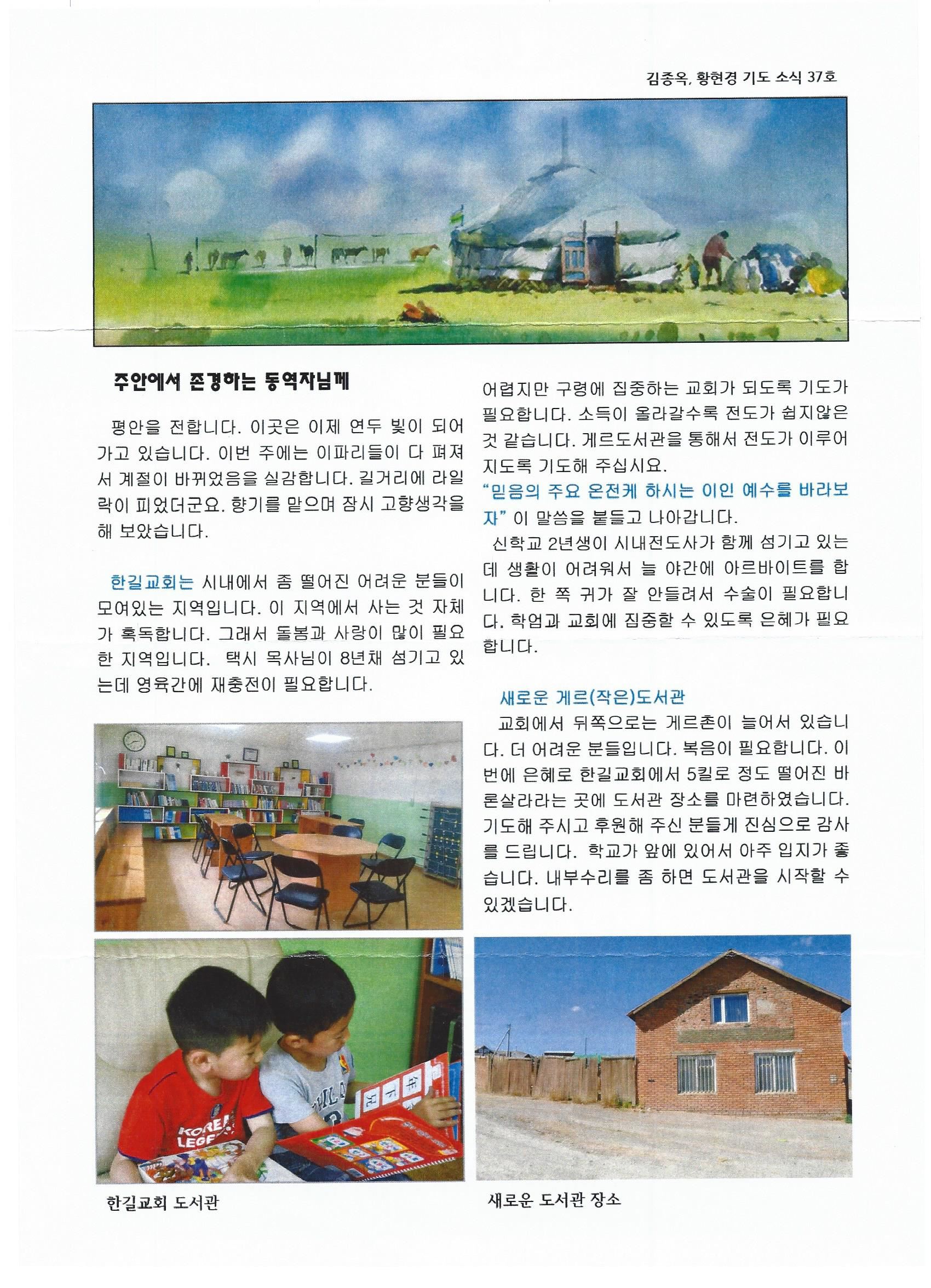 몽골 - 2019년 6월 "주안에서 사랑하는 동역자님께" 김종옥선교사