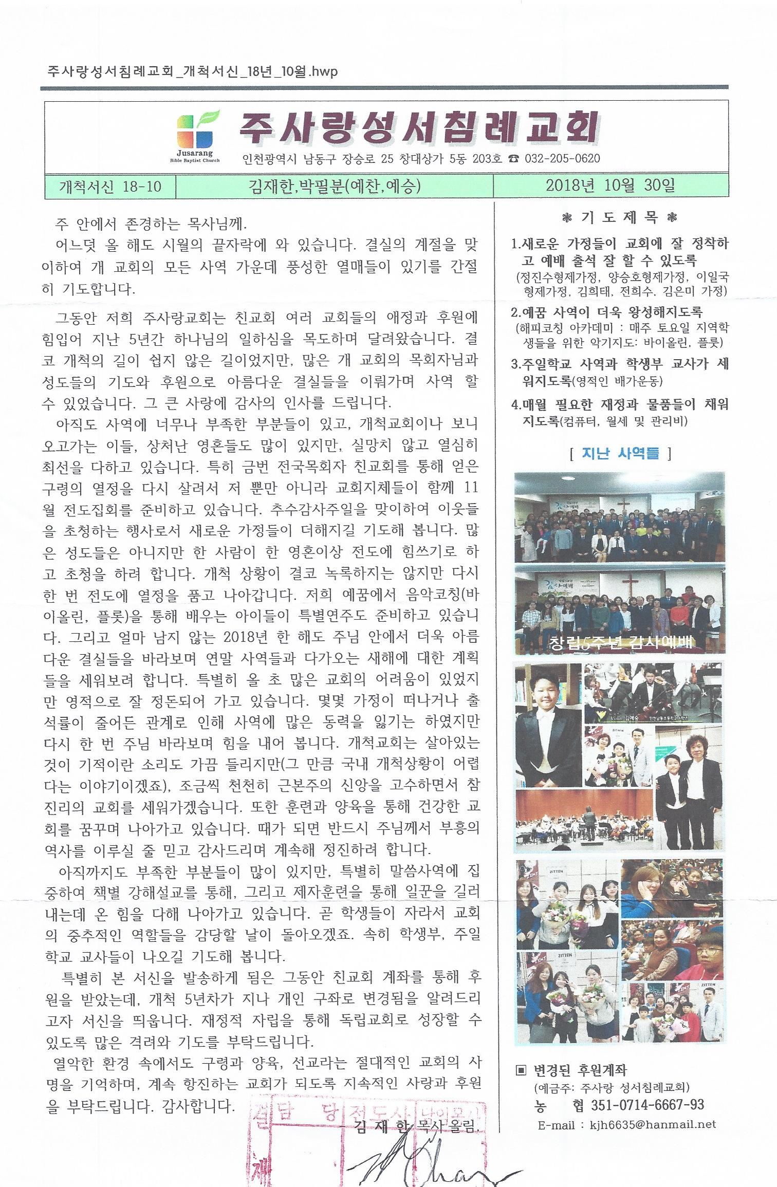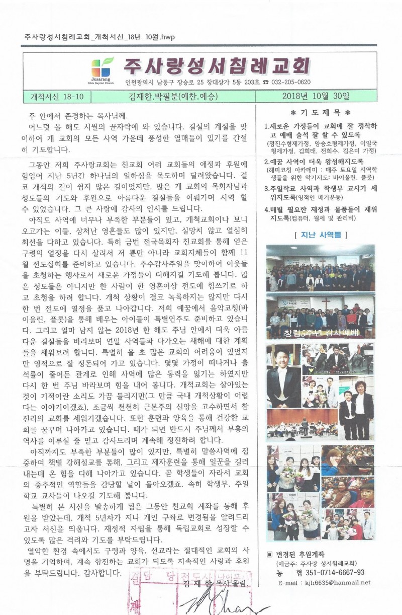 인천 - 2018년 10월 (주사랑성서침례교회 개척서신)
