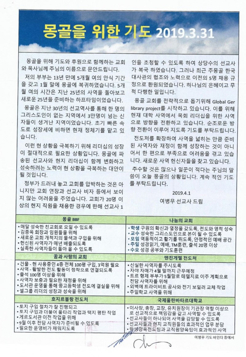 몽골 - 2019년 3월 "몽골을 위한 기도" 여병무선교사