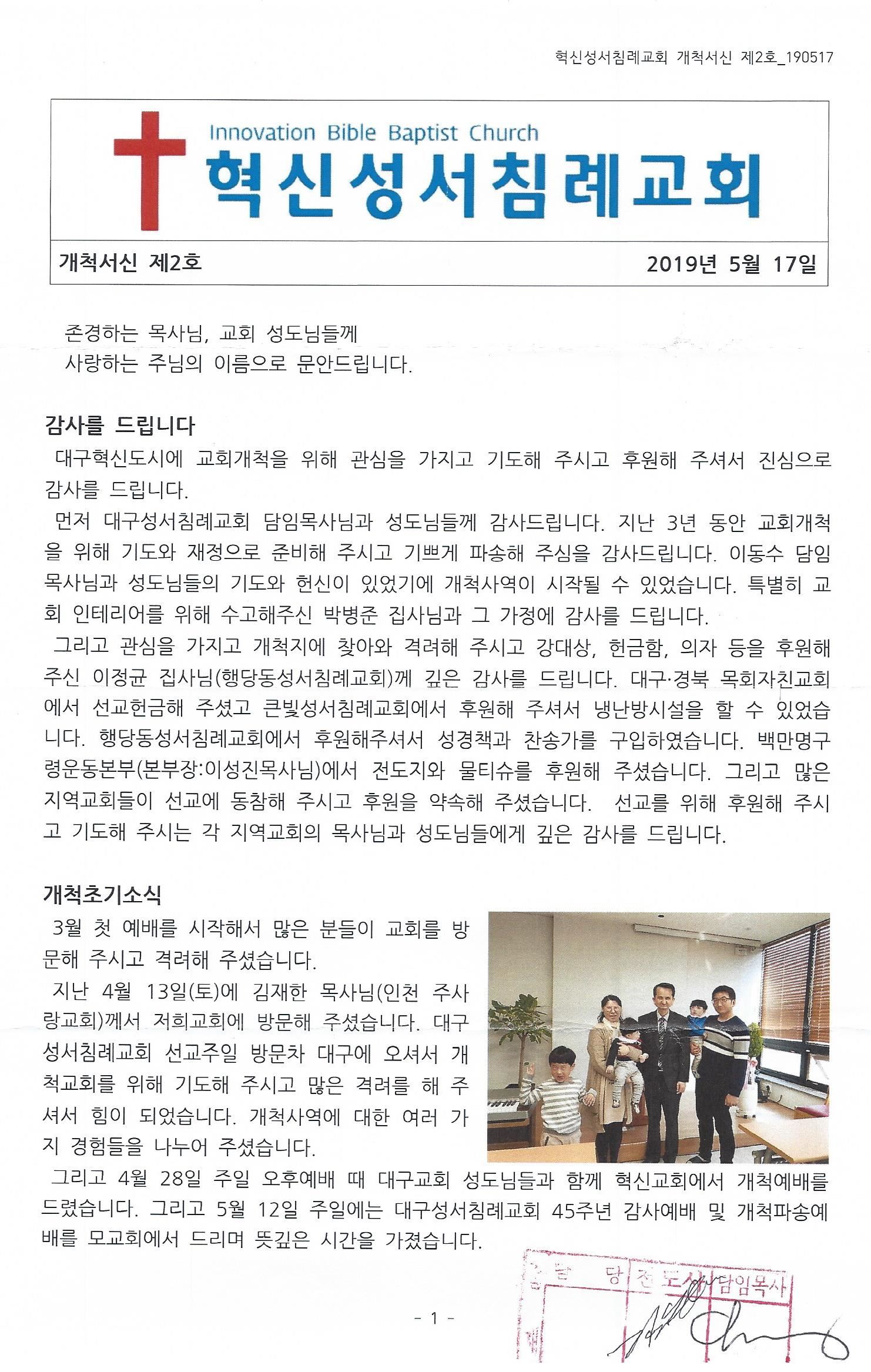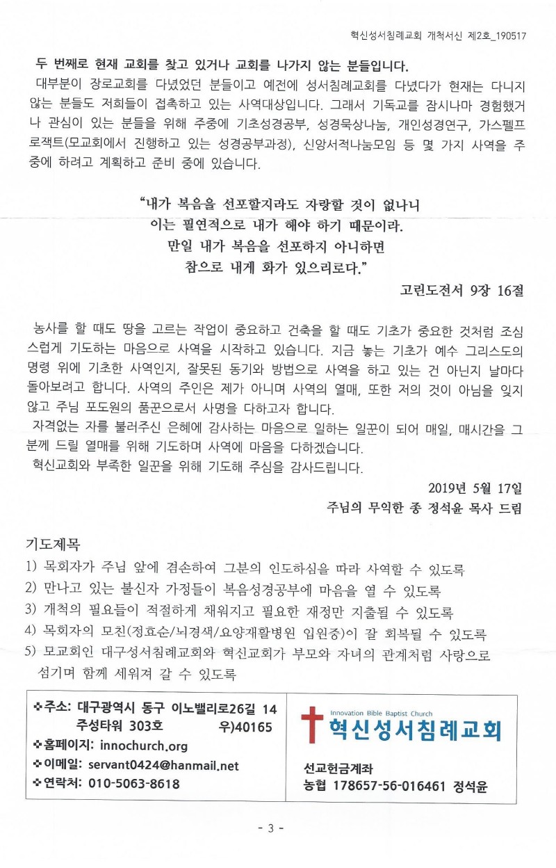 대구 - 2019년 5월 [혁신성서침례교회 개척서신]