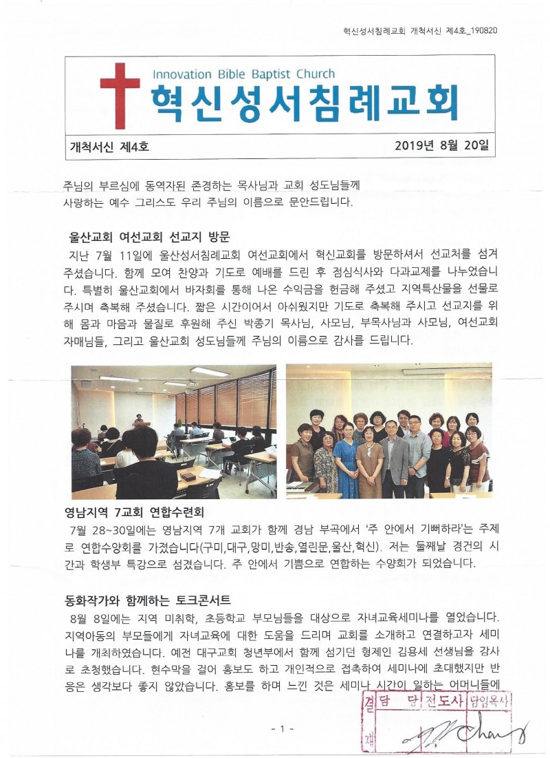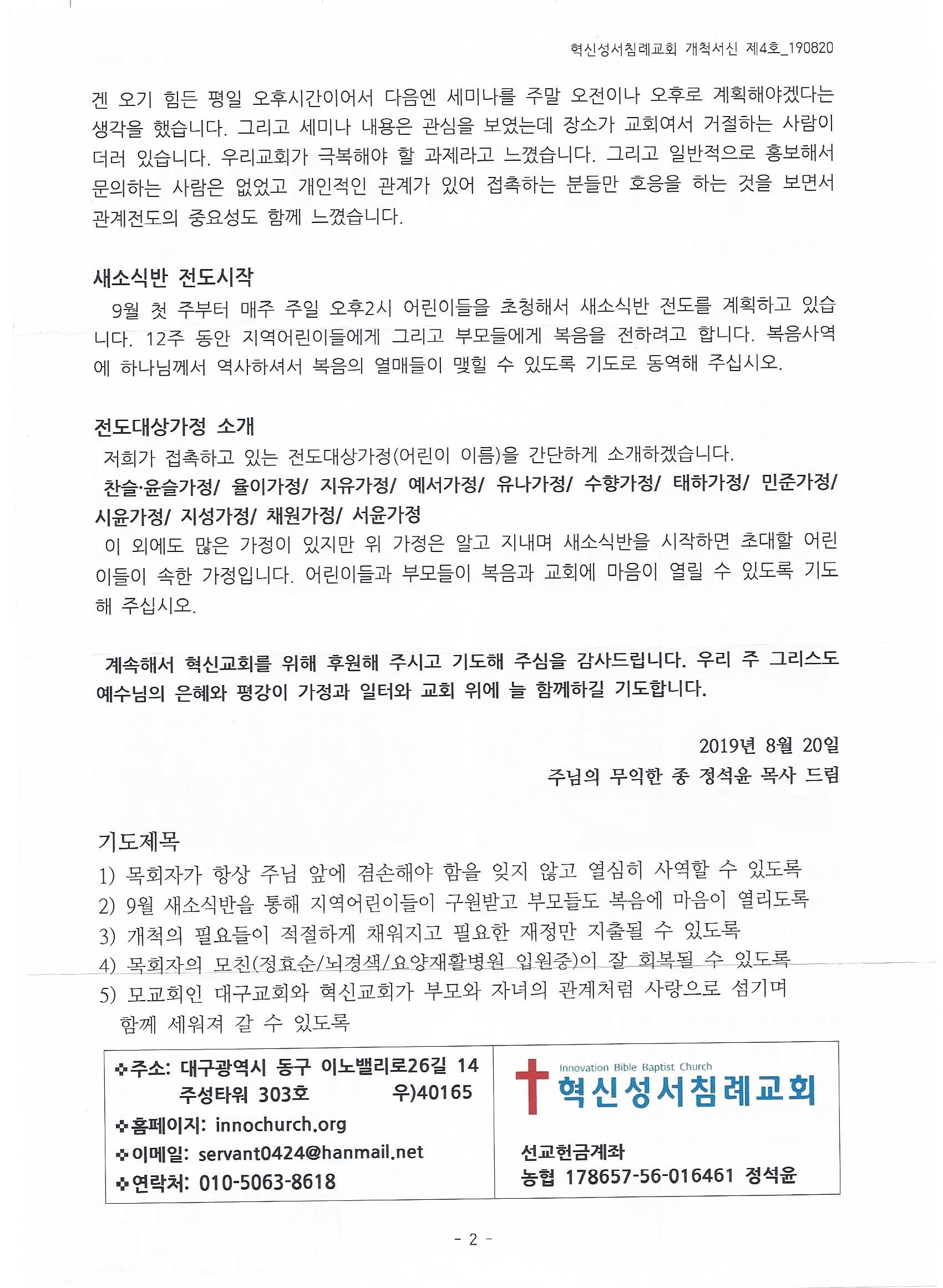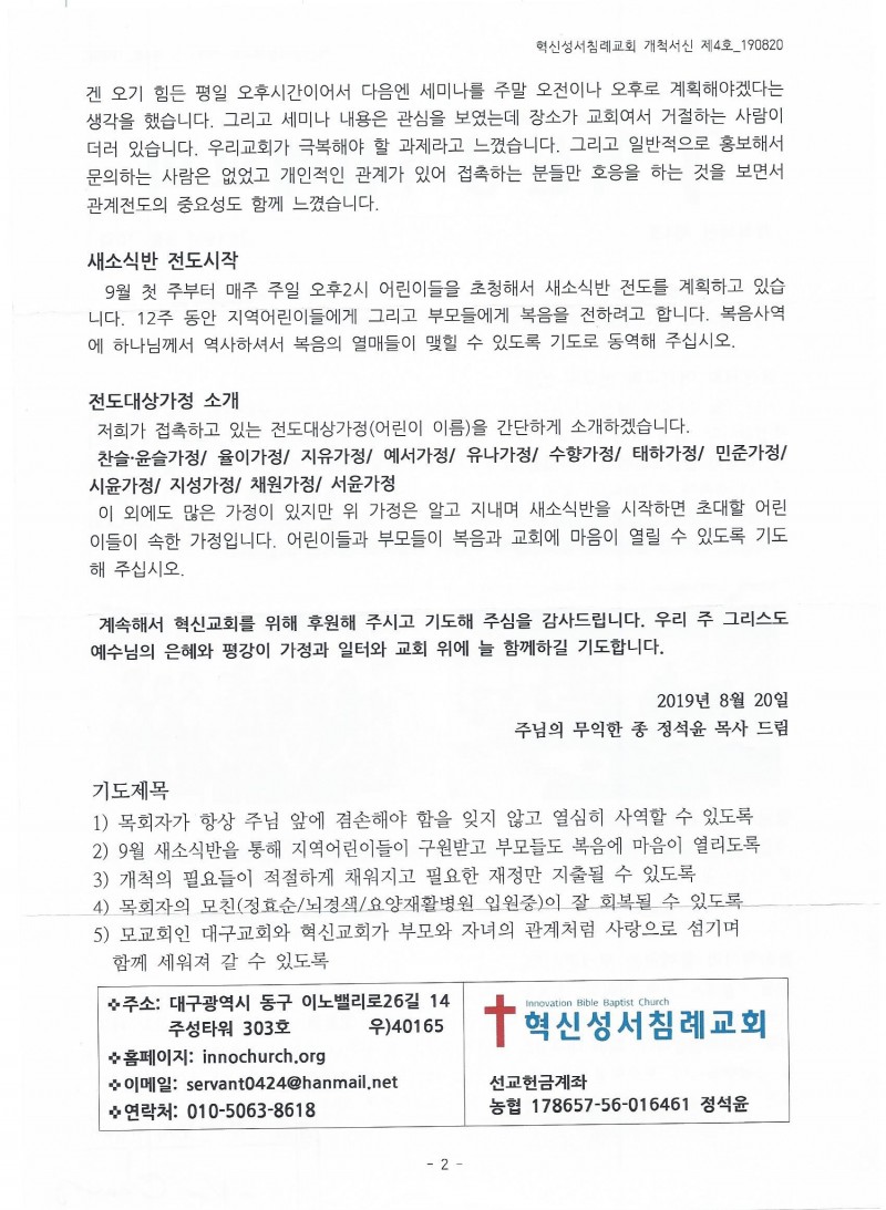 대구 - 2019년 8월 [혁신성서침례교회 개척서신]
