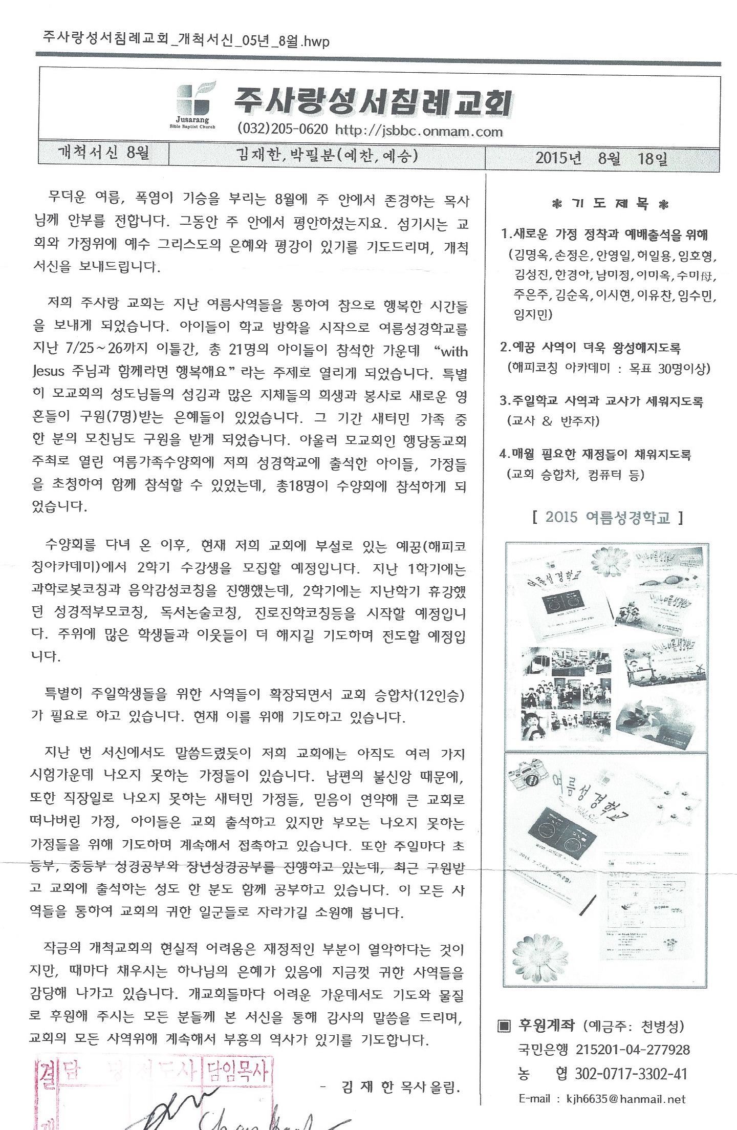 인천 - 2015년 8월 18일 (주사랑성서침례교회 개척서신)