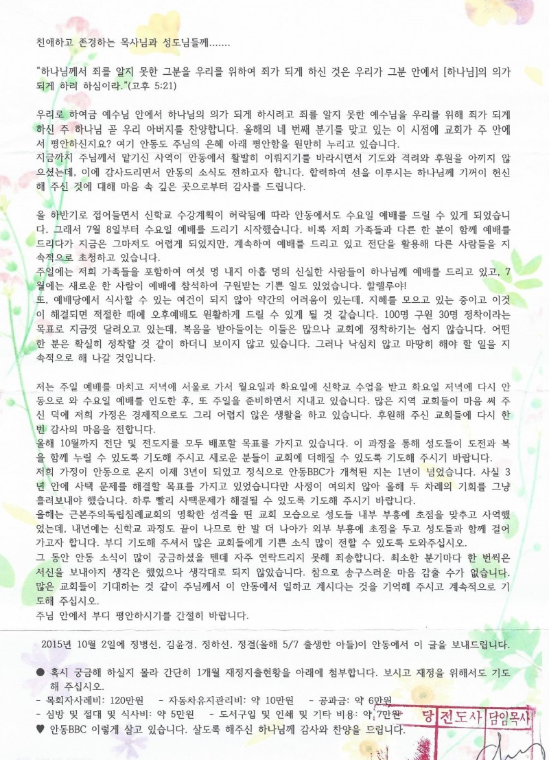 안동 - 2015년 10월 2일 (안동성서침례교회 개척서신)