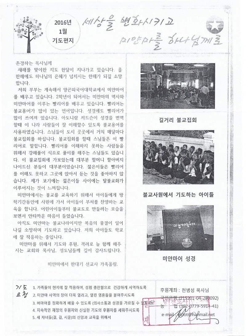 미얀마 - 2016년 1월 "세상을 변화시키고 미얀마를 하나님께로" (한대기선교사)