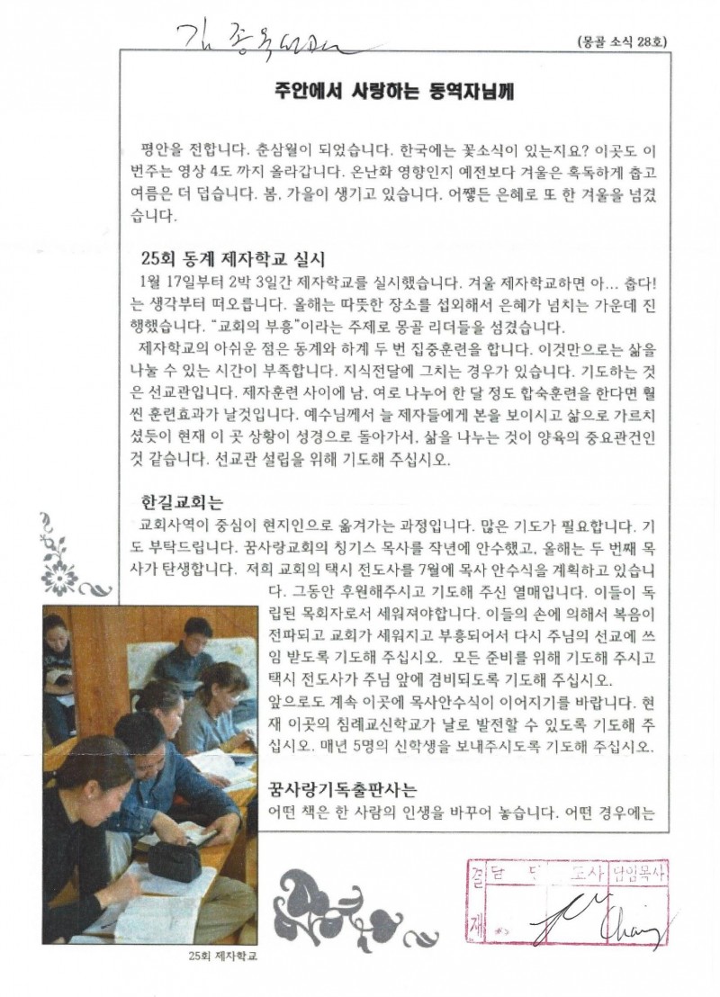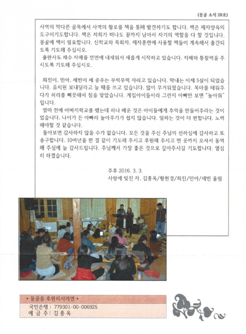몽골 - 2016년 3월 3일 "주안에서 사랑하는 동역자님께" 김종옥선교사