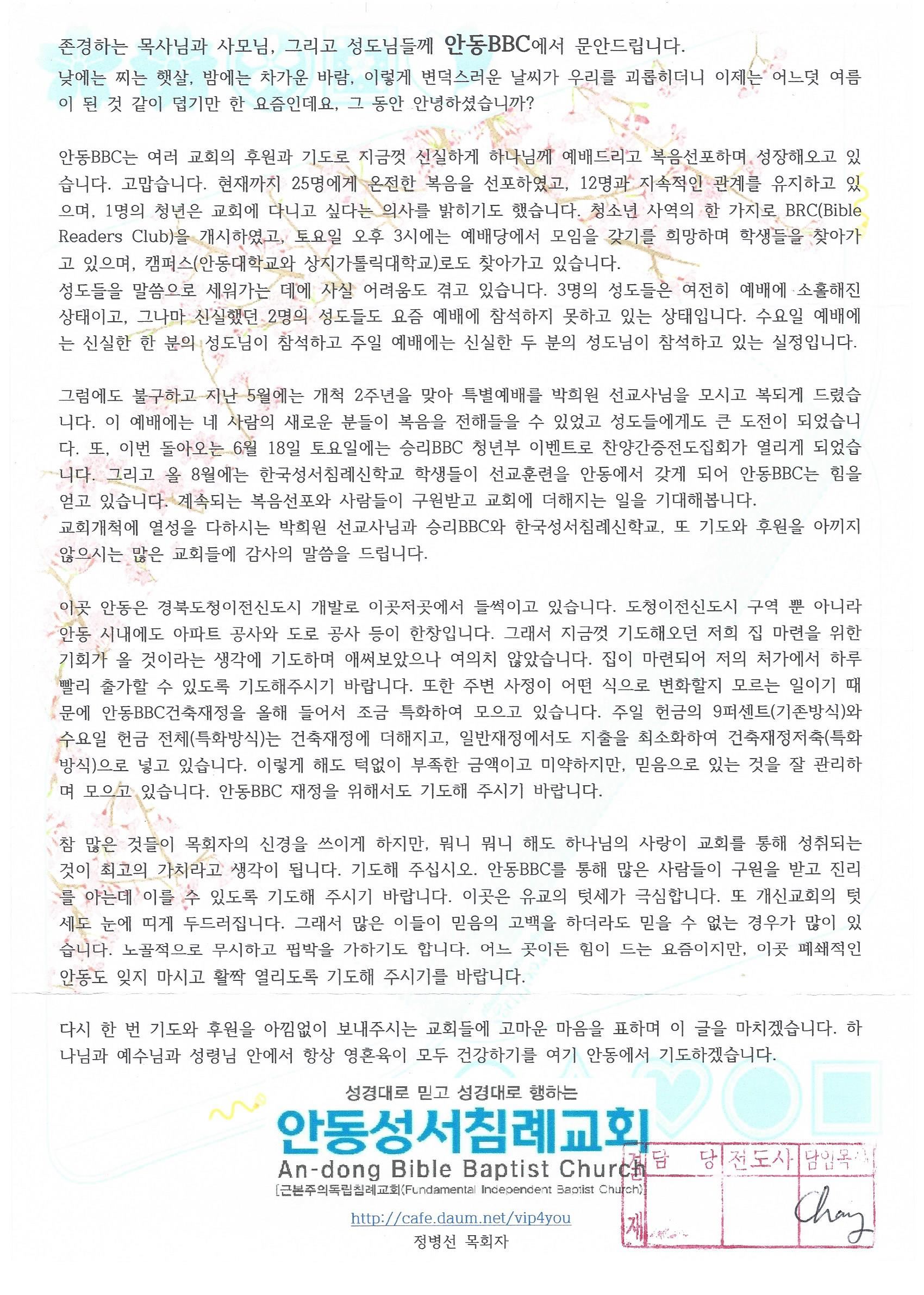 안동 - 2016년 6월 (안동성서침례교회 개척서신)
