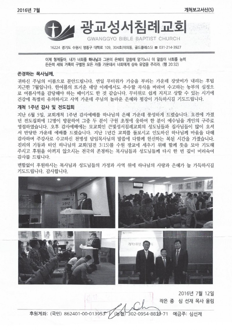 경기도 - 2016년 7월 (광교성서침례교회 개척서신)