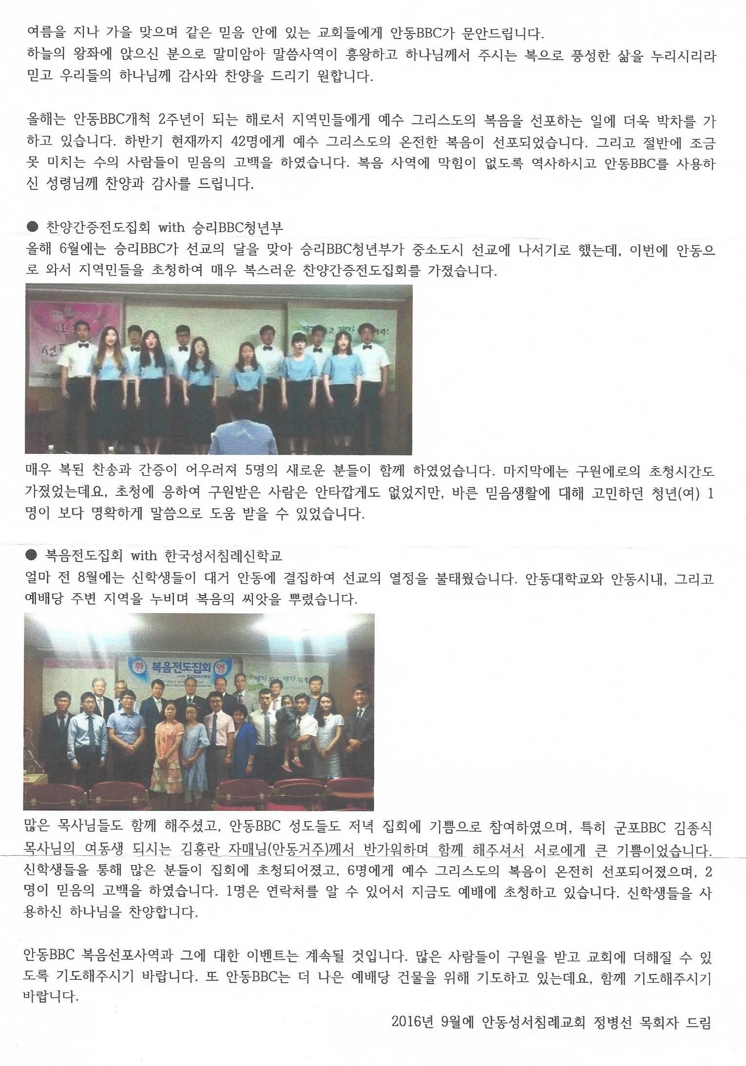 안동 - 2016년 9월 (안동성서침례교회 개척서신)