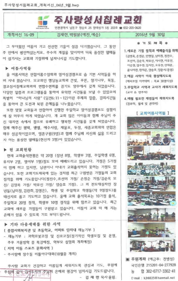 인천 - 2016년 9월 (주사랑성서침례교회 개척서신)