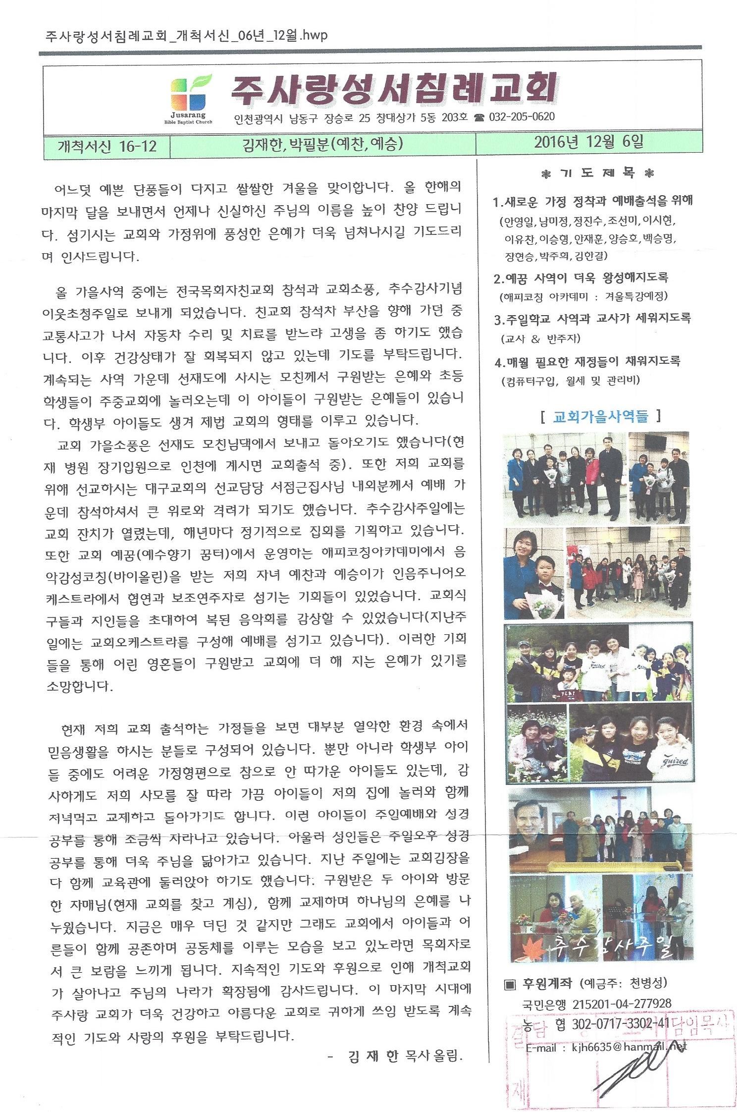 인천 - 2016년 12월 (주사랑성서침례교회 개척서신)