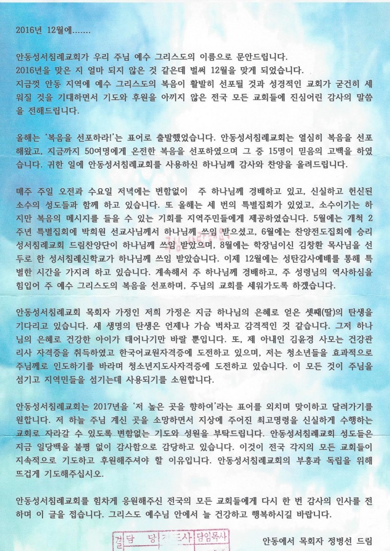 안동 - 2017년 1월 (안동성서침례교회 개척서신)