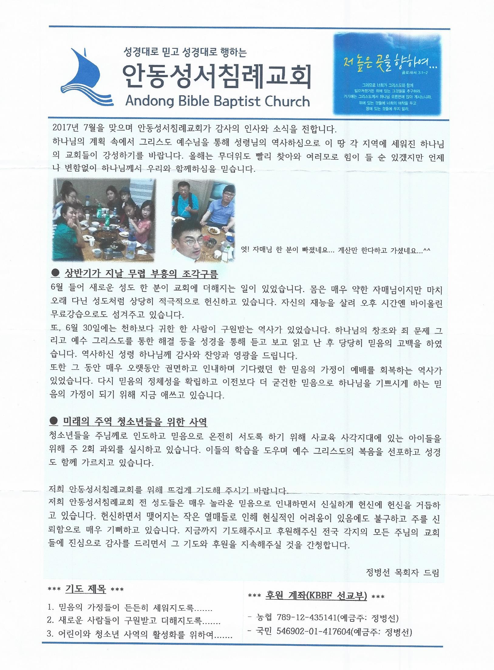 안동 - 2017년 7월 (안동성서침례교회 개척서신)