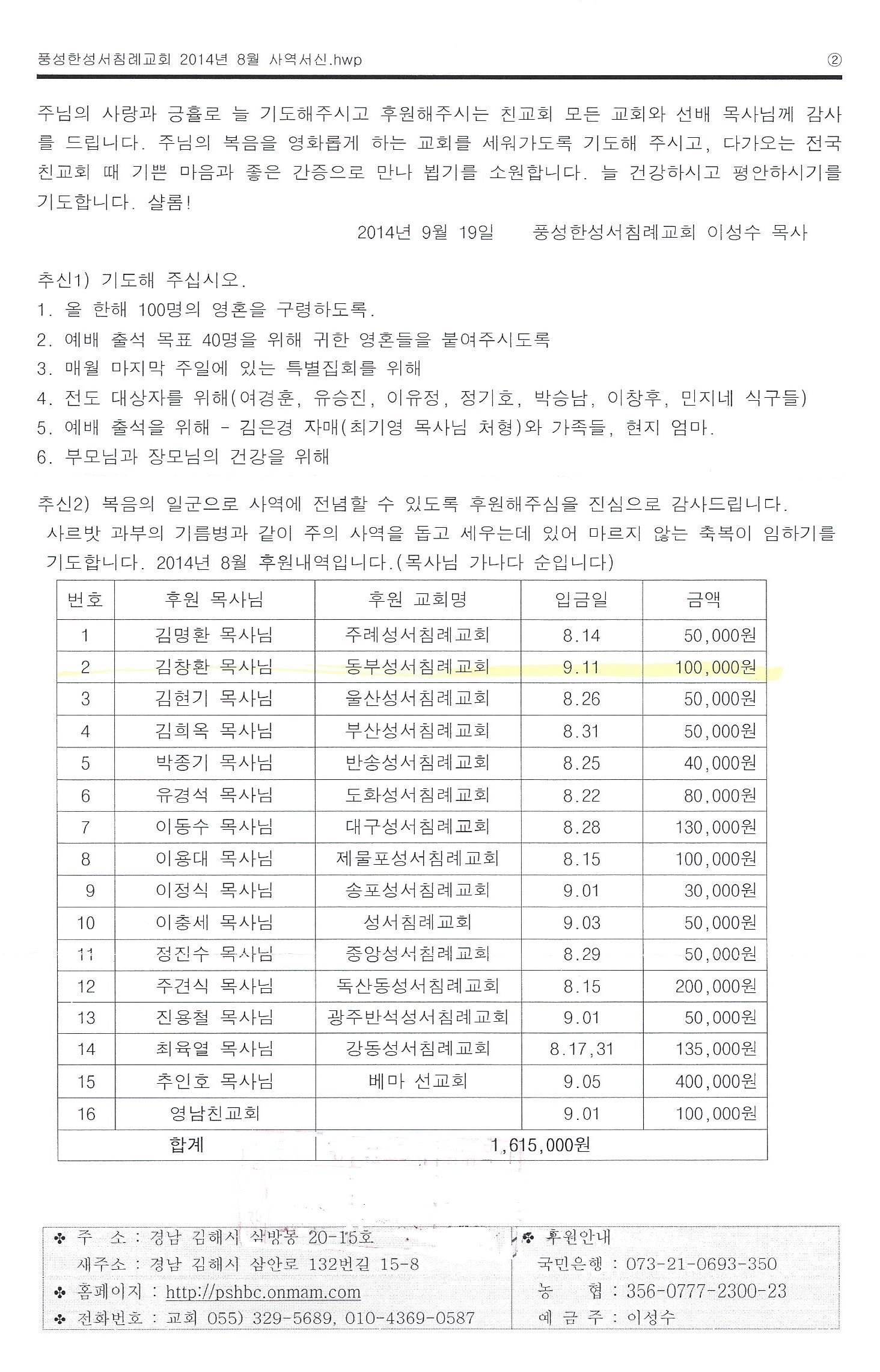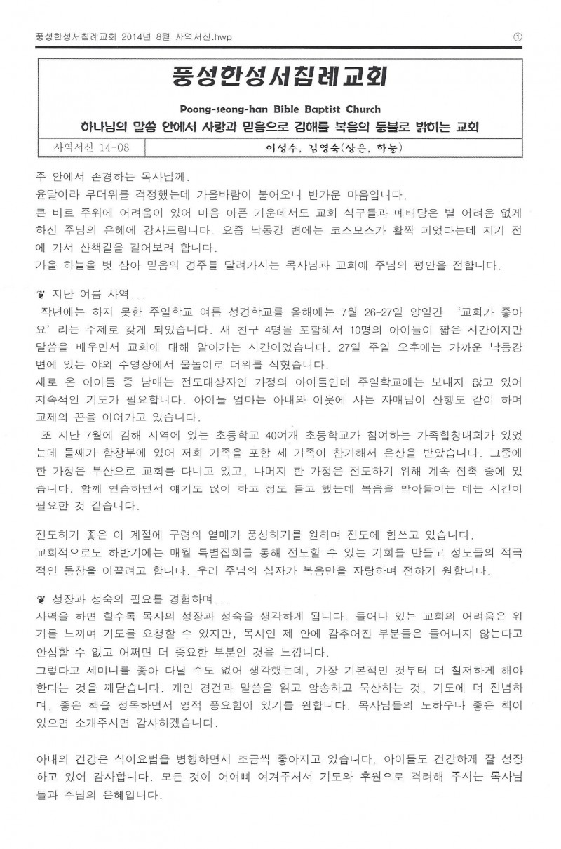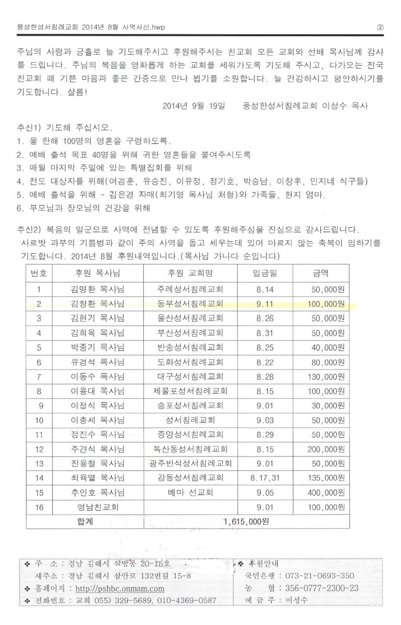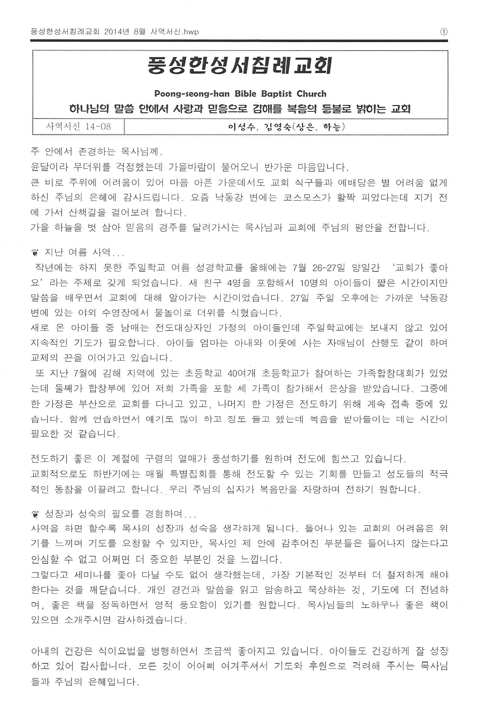 김해- 2014년 9월 19일 (풍성한성서침례교회 선교편지)