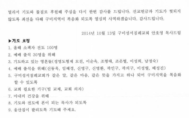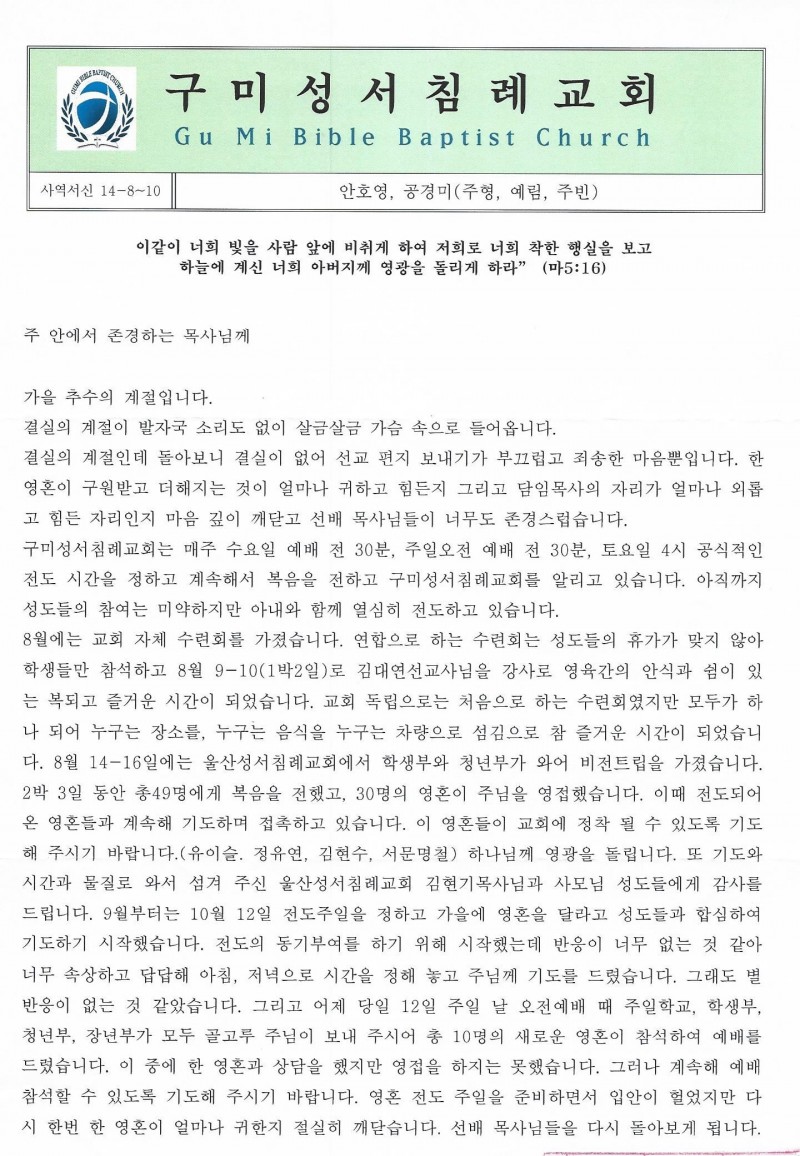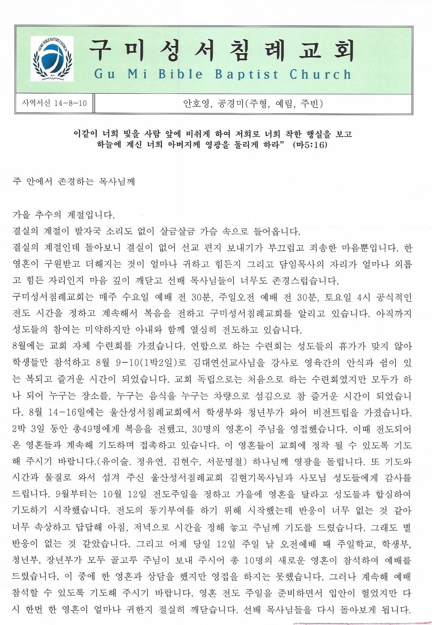 경북 - 2014년 8월 10일 (구미성서침례교회 선교편지)