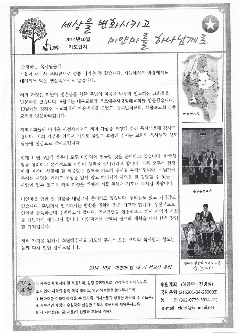 미얀마 - 2014년 10월 "세상을 변화시키고 미얀마를 하나님께로" (한대기선교사)
