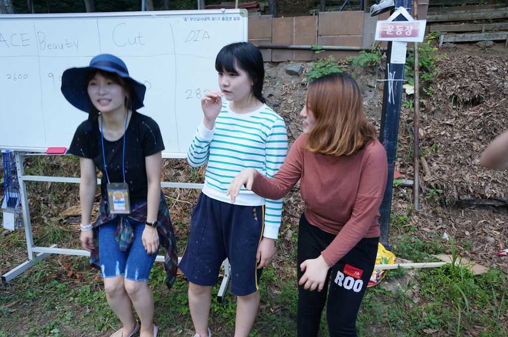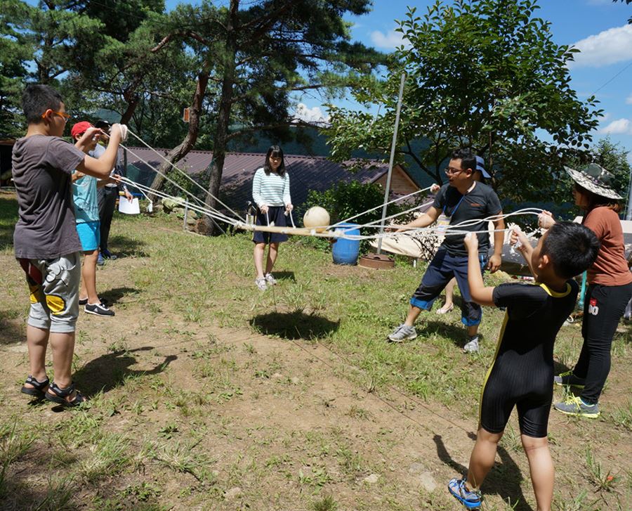야외 운동장에서 단합 공던지기 줄다리기 물이어 받기 릴레이