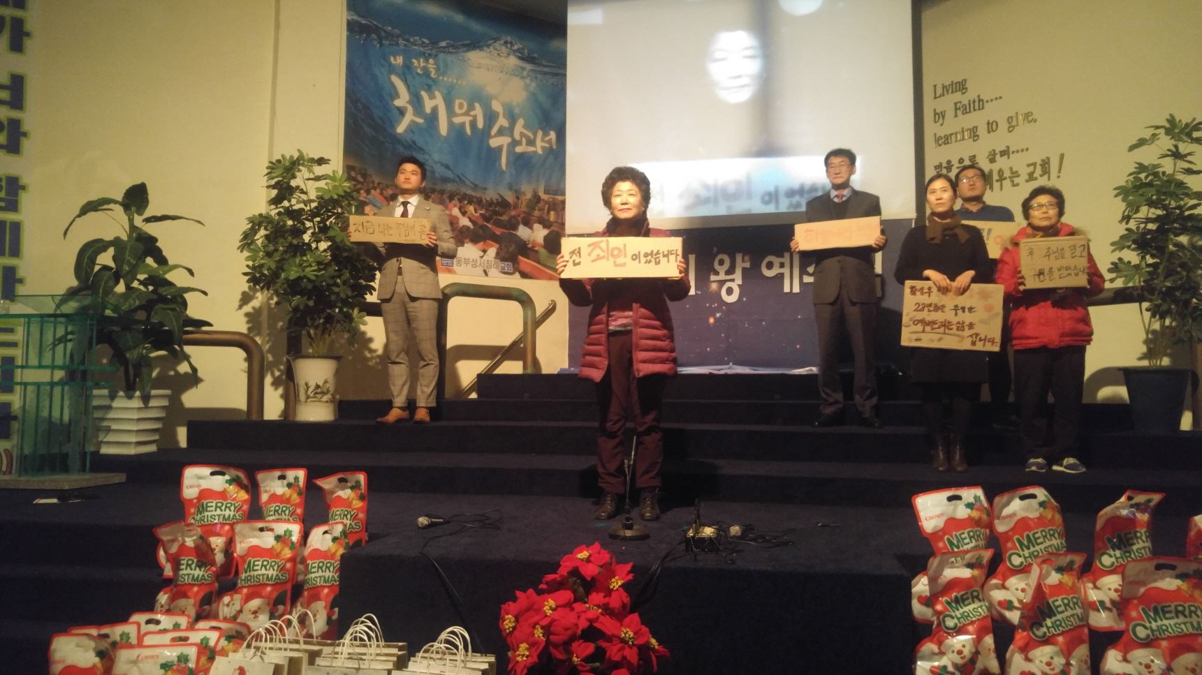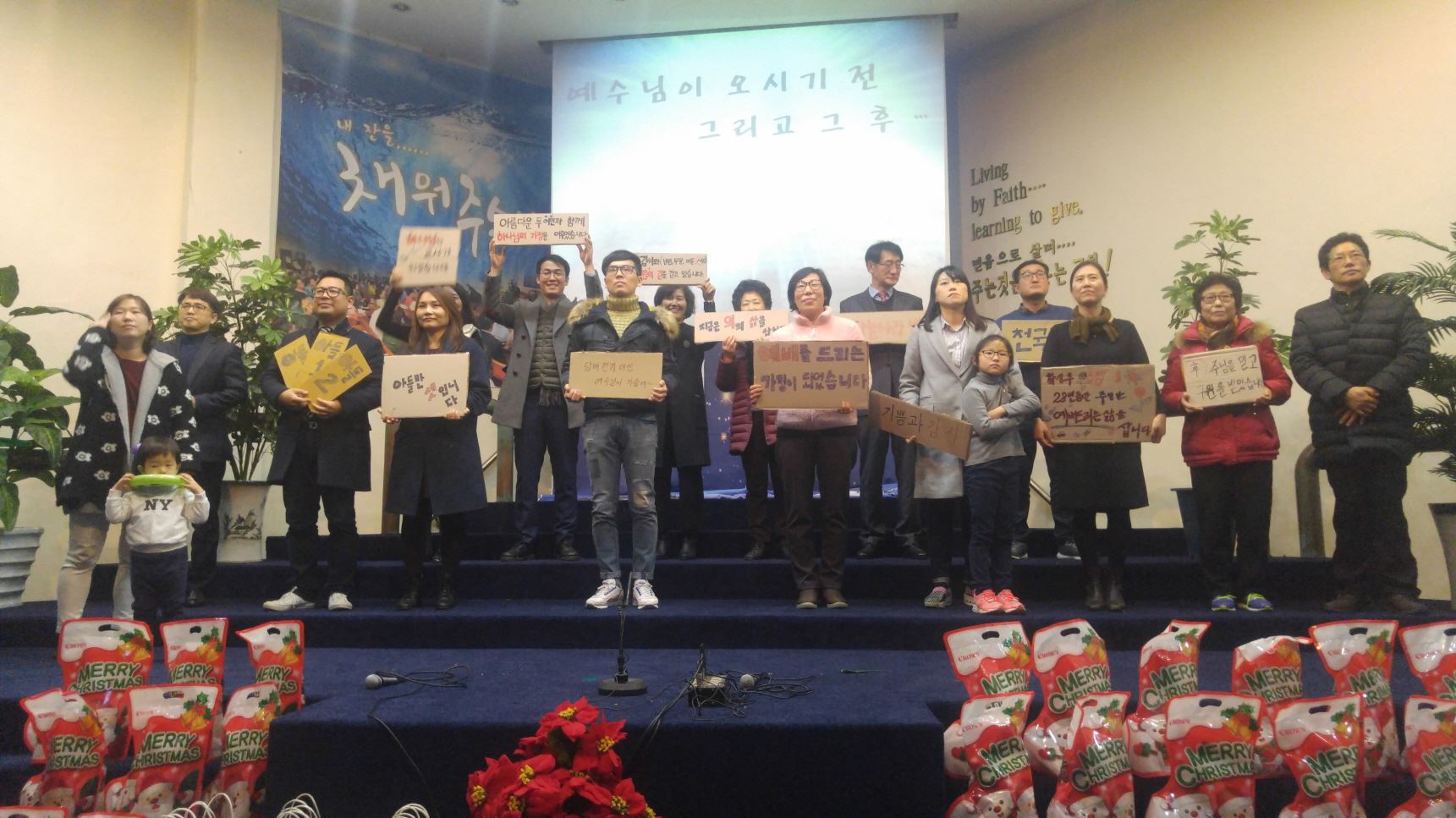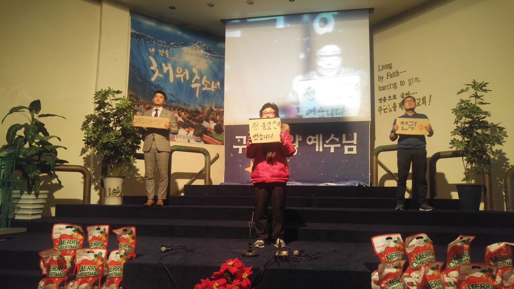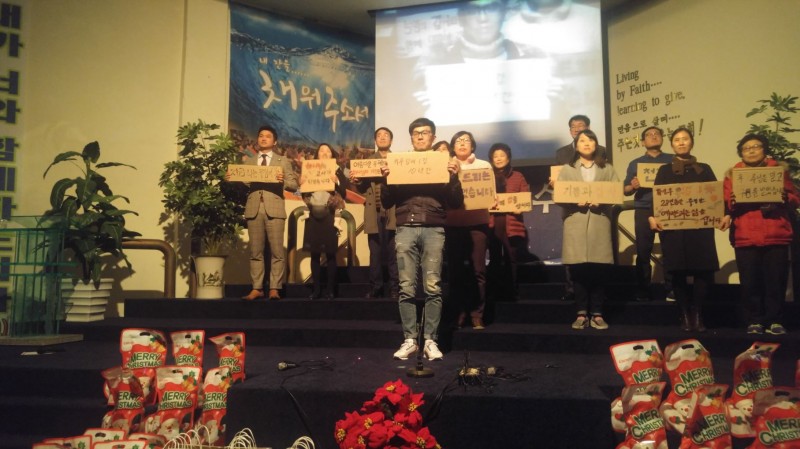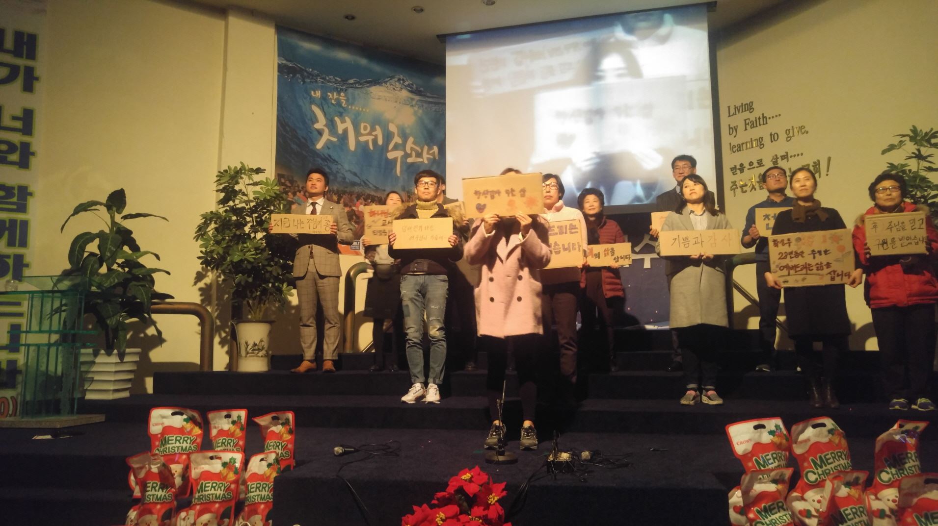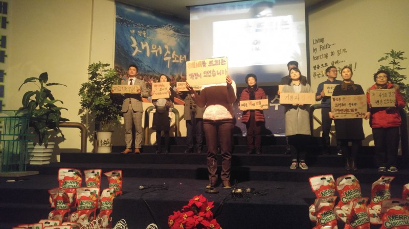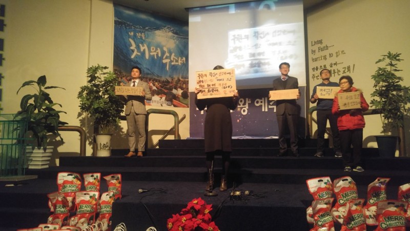 믿음의 선배되신 장년부는 구원받기 전과 후를 골판지에 적어 간증과 감사찬양으로 고백하며